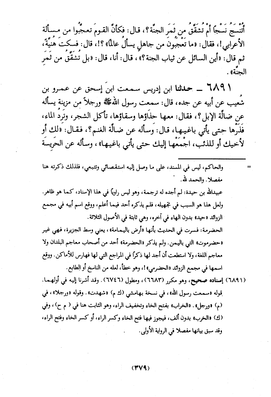6891 - حدثنا ابن إدريس سمعت ابنَ إسحق عن عمرو بن شُعيب عن أبيه عن جده، قال: سمعت رسول الله -صلي الله عليه وسلم - ورجلاً بن مزينة يسأله عنِ ضالَّة الإبل؟، فقال: معها حِذَاؤها وسقاؤها، تأكل الشجر، وتَرِدُ الماء، فَذرْها حتى يأتي باغيها، قال: وسأله عن ضالَّة الغنم؟، فقال: "لك أِو لأخيك أو للذئب، اجْمَعْها إليك حتى يأتي باغيها"، وسأله عن الحَرِيسة