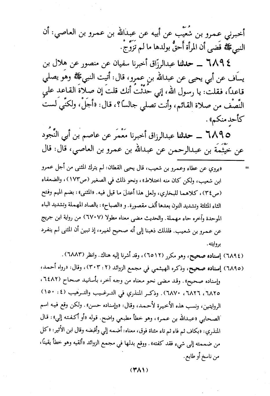 = "يروي عن عطاء وعمرو بن شعيب، قال يحيى القطان: لم يترك المثنى من أجل عمرو ابن شعيب، ولكن كان منه اختلاط"، ونحو ذلك في الصغير (ص 173)، والضعفاء (ص 34)، كلاهما للبخاري، ولعل هذا أعدل ما قيل فيه. "المثنى": بضم الميم وفتح الثاء المثلثة وتشديد النون بعدها ألف مقصورة. و"الصباح": بالصاد المهملة وتشديد الباء الموحدة وآخره حاء مهملة. والحديث مضى معناه مطولاً (6707) من رواية ابن جُريج عن عمرو بن شعيب. فلذلك ذهبنا إلى أنه صحيح لغيره، إذ تبين أن المثنى لم ينفرد بروايته.