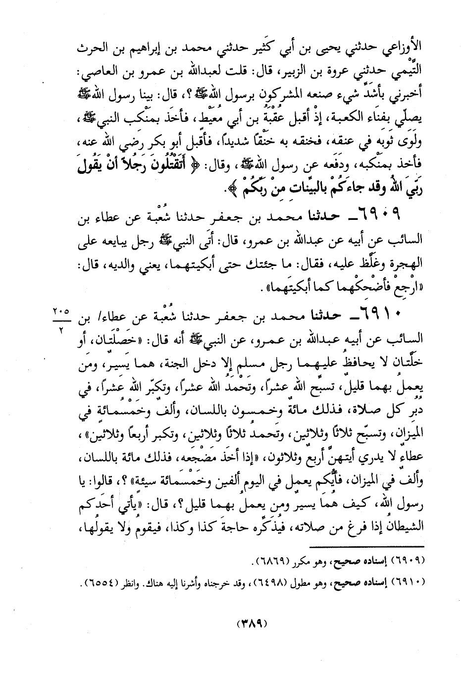 الأوزاعي حدثني يحيى بن أبي كَثير حدثني محمَّد بن إبراهيم بن الحرث التَّيْمي حدثني عروة بن الزبير، قال: قلت لعبد الله بن عمرو بن العاصي: أخبرني بأشَدِّ شيء صنعه المشركوِن برسول الله -صلي الله عليه وسلم -؟، قال: بينا رسول الله -صلي الله عليه وسلم - يصلّي بفِنَاء الكعبة، إذْ أقبل عُقْبةُ بن أبي مُعَيطٍ، فأخَذ بمَنْكب النبي -صلي الله عليه وسلم -، ولَوَى ثَوبه في عنقه، فخنقه به خَنْقاً شديداً، فأقبل أبو بكر رَضي الله عنه، فأخذ بمَنْكبه، ودَفَعه عن رسول الله -صلي الله عليه وسلم -، وقال: {أَتَقْتُلُونَ رَجُلًا أَنْ يَقُولَ رَبِّيَ اللَّهُ وَقَدْ جَاءَكُمْ بِالْبَيِّنَاتِ}.