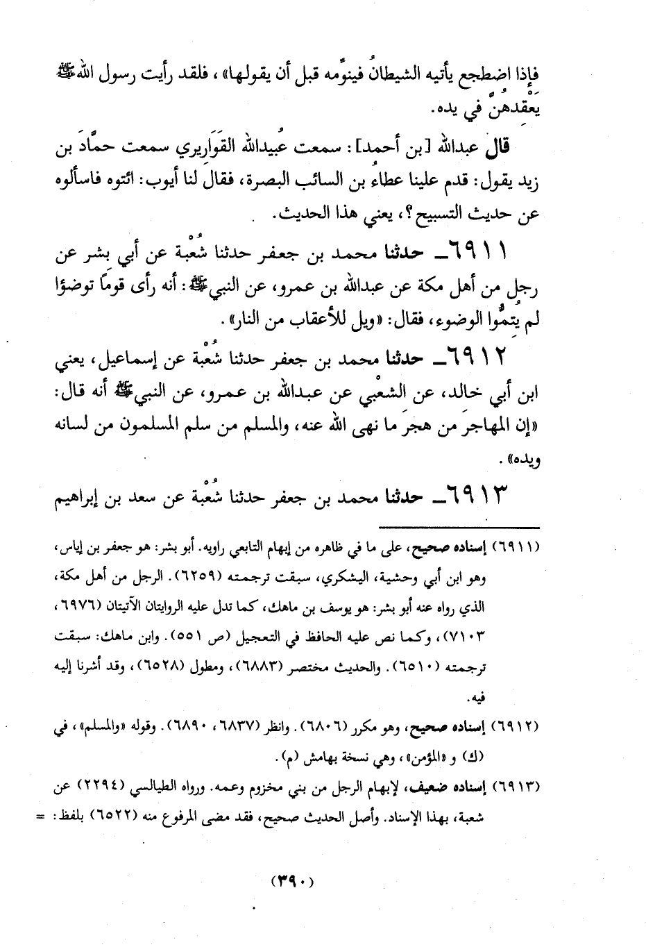 6911 - حدثنا محمد بن جعفرحدثنا شُعْبة عن أبي بشر عن رجلٍ من أهل مكة عن عبد الله بن عمرو، عن النبي - صلى الله عليه وسلم -: أنه رأى قوماً توضؤا لم يتمُّوا الوضوء، فقال: "ويل للأعقاب من النار".
