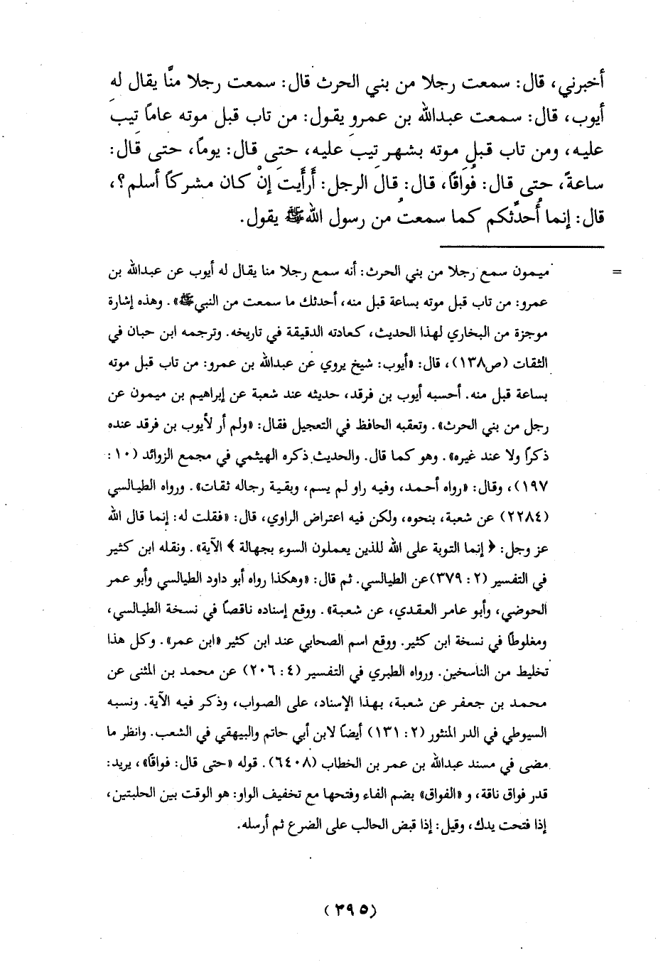 أخبرني، قال: سمعت رجلا من بني الحرثْ قال: سمعت رجلا منَّا يقال له أيوب، قال: سمعت عبد الله بن عمروِ يقول: من تاب قبل موته عاماً تيبَ عليه، ومن تاب قبل موته بشهر تيب عليه، حتى قال: يوماً، حتى قَال: ساعةً، حتى قال: فُوَاقاً، قال: قالَ الرجل: أَرأَيتَ إنْ كان مشركاً أسلم؟، قال: إنما أُحدِّثكم كما سمعتُ من رسول الله - صلى الله عليه وسلم - يقول.