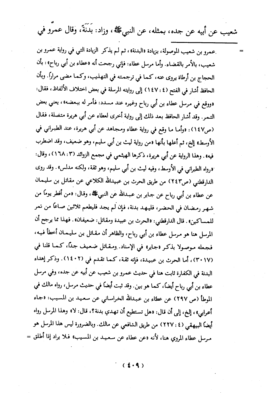 = عمرو بن شعيب الموصولة، بزيادة "البدنة"، ثم لم يذكر الزيادة التي في رواية عمرو بن شعيب، بالأمر بالقضاء. وأما مرسل عطاء: فإني رجحت أنه "عطاء بن أبي رباح": بأن الحجاج بن أرطاة يروى عنه، كما في ترجمته في التهذيب، وكما مضى مراراً. وبأن الحافظ أشار في الفتح (4: 147) إلى روايته المرسلة في بعض اختلاف الألفاظ، فقال: "ووقع في مرسل عطاء بن أبي رباح وغيره عند مسدد: فأمرله ببعضه"، يعني بعض التمر. وقد أشار الحافظ بعد ذلك إلى رواية أخرى لعطاء عن أبي هريرة متصلة، فقال (ص 147): "وأما ما وقع في رواية عطاء ومجاهد عن أبي هريرة، عند الطبراني في الأوسط" إلخ، ثم أعلها بأنها "من رواية ليث بن أى سليم، وهو ضعيف، وقد اضطرب فيه". وهذا الرواية عن أى هرسة، ذكرها الهيثمي في مجمع الزوائد (3: 168)، وقال: "رواه الطبراني - في الأوسط، وفيه ليث بن أبي سليم، وهو ثقة، ولكنه مدلس". وقد روى الدارقطني (ص 243) من طريق الحرث بن عبيد الله الكلاعي عن مقاتل بن سليمان عن عطاء بن أبي رباح عن جابر بن عبد الله عن النبي -صلي الله عليه وسلم -، وقال: "من أفطر يومًا من شهر رمضان في الحضر، فليهد بدنة، فإن لم يجد فليطعم ثلاثين صاعًا من تمر للمساكين". قال الدارقطني: "الحرث بن عبيدة ومقاتل: ضعيفان. فهذا مما يرجع أن المرسل هنا هو مرسل عطاء بن أبي رباح، والظاهر أن مقاتل بن سليمان أخطأ فيه، فجعله موصولا بذكر "جابر" في الإِسناد .. ومقاتل ضعيف جداً، كما قلنا في (3017)، أما الحرث بن عبيدة، فإنه ثقة، كما تقدم في (1402). وذكر إهداء البدنة في الكفارة ثابت هنا في حديث عمرو بن شعيب عن أبيه عن جده، وفي مرسل عطاء بن أبي رباح أيضاً، كما هو بين. وقد ثبت أيضاً في حديث مرسل، رواه مالك في الموطأ (ص 297) عن عطاء بن عبد الله الخراساني عن سعيد بن المسيب: "جاء أعرابي"، إلخ، الى أن قال: "هل تستطع أن تهدي بدنة؟، قال: لا" وهذا المرسل رواه أيضاً البيهقي (4: 227) من طريق الشافعي عن مالك. وبالضرورة ليس هذا المرسل هو مرسل عطاء المروي هنا، لأنه "عن عطاء عن سعيد بن المسيب" فلا يراد إذا أطلق