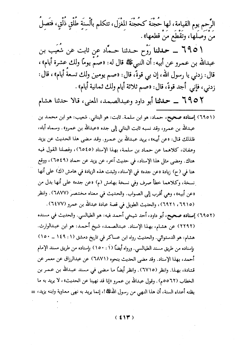(6951) إسناده صحيح، حماد: هو ابن سلمة. ثابت: هو البناني. شعيب: هو ابن محمد بن عبد الله بن عمرو، وقد نسبه ثابت البناني إلى جده "عبد الله بن عمرو". وسماه أباه، فلذلك قال: "عن أبيه"، يريد عبد الله بن عمرو. وقد مضى هذا الحديث عن يزيد وعفان، كلاهما عن حماد بن سلمة، بهذا الإِسناد (6545)، وفصلنا القول فيه هناك. ومضى مثل هذا الإِسناد، في حديث آخر، عن يزيد عن حماد (6549)، ووقع هنا في (ح) زيادة "عن جده" في الإِسناد، وثبتت هذه الزيادة في هامش (ك) على أنها نسخة، وكلاهما خطأ صرف وفى نسخة بهامش (م) "عن جده" على أنها بدل من "عن أبيه"، وهي أقرب إلى الصواب. والحديث في معناه مختصر (6877). وانظر (6915، 6921)، والحديث الطويل في قصة عبادة عبد الله بن عمرو (6477).