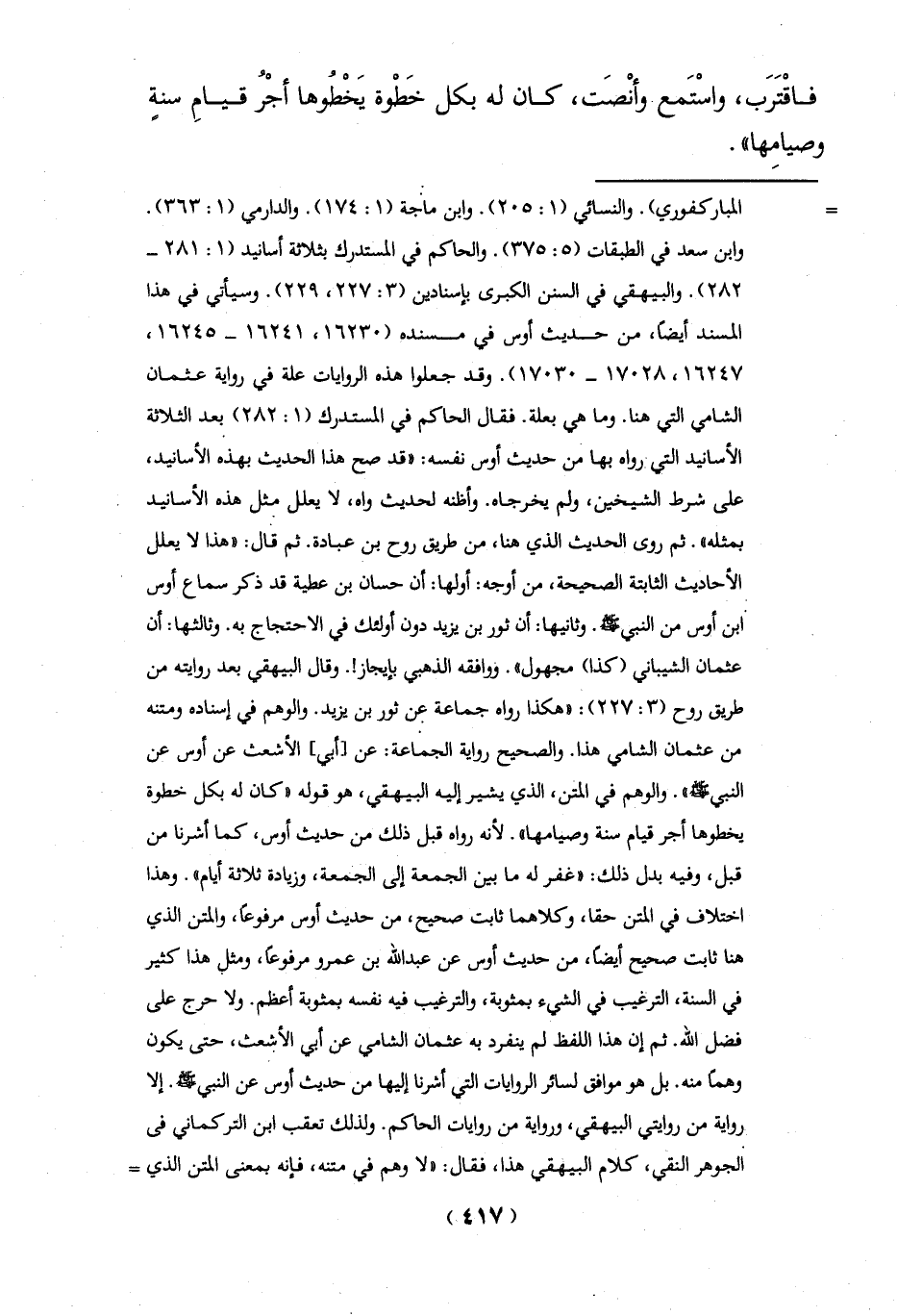وابن سعد في الطبقات (5: 375). والحاكم في المستدرك بثلانة أسانيد (1: 281 - 282). والبيهقى في السنن الكبرى بإسنادين (3: 227، 229). وسيأتي في هذا المسند أيضاً، من حديث أوس في سشده (16230، 16241 - 16245، 16247، 17028 - 17030). وقد جعلوا هذه الروايات علة في رواية عثمان الشامي التى هنا. وما هي بعلة. فقال الحاكم في المستدرك (1: 282) بعد الثلاثة الأسانيد التى- رواه بها من حديث أوس نفسه: "قد صح هذا الحديث بهذه الأسانيد، على شرط الشيخين، ولم يخرجاه. وأظنه لحديث واه، لا يعلل بمثل هذه الأسانيد بمثله". ثم روى الحديث الذي هنا، من طريق روح بن عبادة. ثم قال: "هذا لا يعلل الأحاديث الثابنة الصحيحة، من أوجه: أولها: أن حسان بن عطية قد ذكر سماع أوس ابن أوس من النبي -صلي الله عليه وسلم -. وثانيها: أن ثور بن يزيد دون أولئك في الاحتجاج به. وثالثها: أن عثمان الشيباني (كذا) مجهول". ووافقه الذهبي بإيجاز!. وقال البيهقي بعد روايته من طريق روح (3: 227): "هكذا رواه جماعة عن ثور بن يزيد. والوهم في إسناده ومتنه من عثمان الشامي هذا. والصحيح رواية الجماعة: عن [أبي] الأشعث عن أوس عن النبي -صلي الله عليه وسلم -. والوهم في المتن، الذي يشير إليه البيهقي، هو قوله "كان له بكل خطوة يخطوها أجر قيام سنة وصيامها". لأنه رواه قبل ذلك من حديث أوس، كما أشرنا من قبل، وفيه بدل ذلك: "غفر له ما بين الجمعة إلى الجمعة، وزيادة ثلاثة أيام". وهذا اختلاف في المتن حقا، وكلاهما ثابت صحيح، من حديث أوس مرفوعًا، والمتن الذي هنا ثابت صحيح أيضاً، من حديث أوس عن عبد الله بن عمرو مرفوعًا، ومثل هذا كثير في السنة، الترغيب في الشيء بمثوبة، والترغيب فيه نفسه بمثوبة أعظم. ولا حرج على فضل الله. ثم إن هذا اللفقا لم ينفرد به عثمان الشامي عن أبي الأشعث، حتى يكون وهما منه. بل هو موافق لسائر الروايات التى أشرنا إليها من حديث أوس عن النبي -صلي الله عليه وسلم -. إلا رواية من روايتي البيهقي، ورواية من روايات الحاكم. ولذلك تعقب ابن التركماني في الجوهر النقي، كلام البيهقي هذا، فقال: "لا وهم في متنه، فإنه بمعنى المتن الذي =