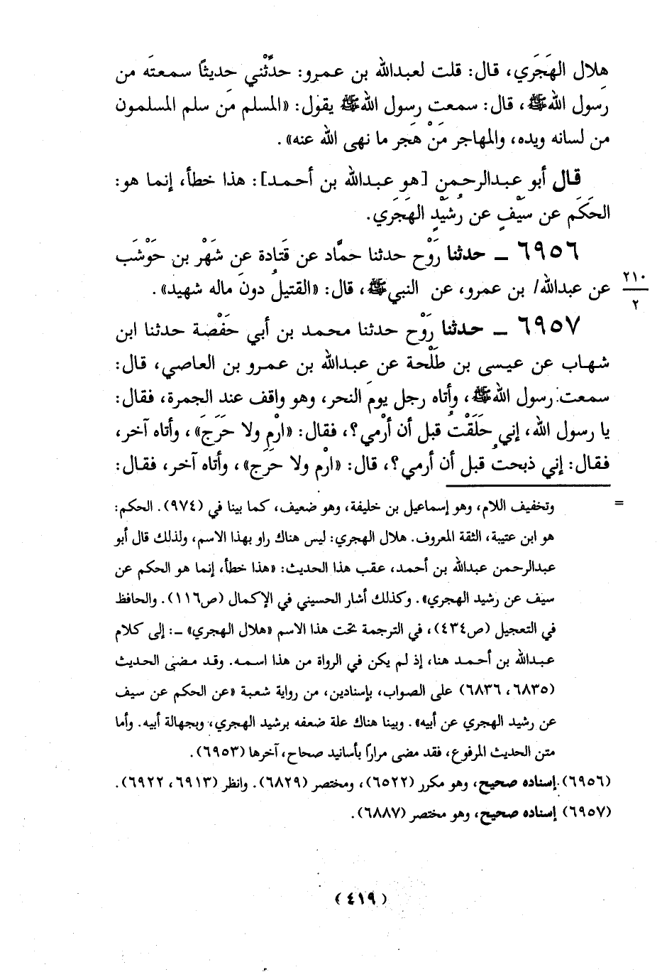 = وتخفيفى اللام، وهو إسماعيل بن خليفة، وهو ضعيف، كما بينا في (974). الحكم: هو ابن عتيبة، الثقة المعروف. هلال الهجري: ليس هناك راو بهذا الاسم، ولذلك قال أبو عبد الرحمن عبد الله بن أحمد، عقب هذا الحديث: "هذا خطأ، إنما هو الحكم عن سيف عن رشيد الهجري". وكذلك أشار الحسيني في الإكمال (ص 116). والحافظ في التعجيل (ص 434)، في الترجمة تحت هذا الاسم "هلال الهجري"-: إلى كلام عبد الله بن أحمد هنا، إذ لم يكن في الرواة من هذا اسمه. وقد مضي الحديث (6835، 6836) على الصواب، بإسنادين، من روايةً شُعبة "عن الحكم عن سيف عن رشيد الهجري عن أبيه". وبينا هناك علة ضعفه برشيد الهجري" وبجهالة أبيه. وأما متن الحديث المرفوع، فقد مضى مراراً بأسانيد صحاح، آخرها (6953).