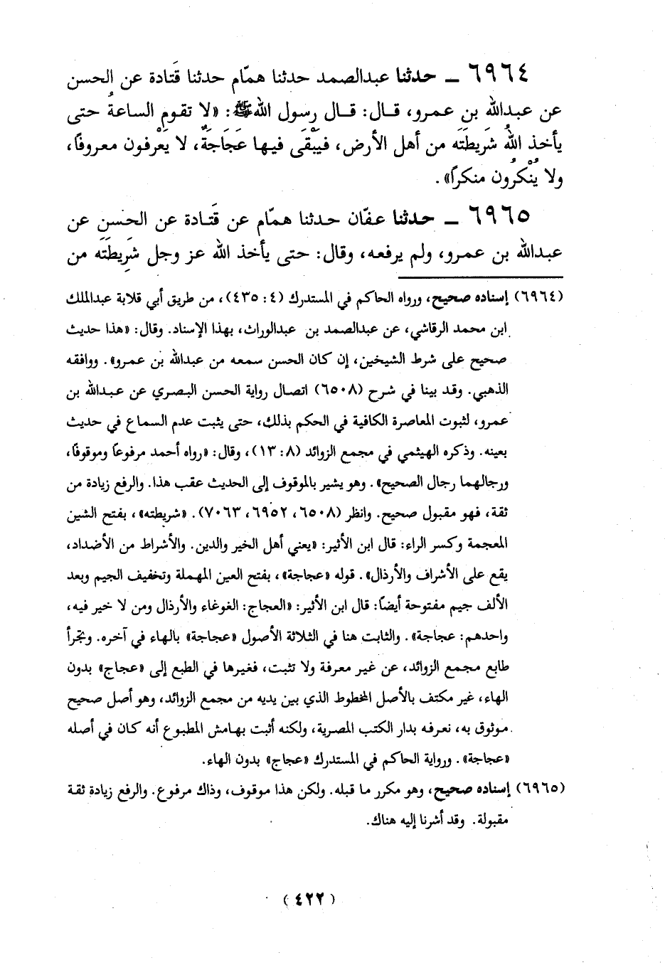 (6964) إسناده صحيح، ورواه الحاكم في المستدرك (4: 435)، من طريق أبي قلابة عبد الملك ابن محمد الرقاشي، عن عبد الصمد بن عبد الوراث، بهذا الإِسناد. وقال: "هذا حديث صحيح على شرط الشيخين، إن كان الحسن سمعه من عبد الله بن عمرو". ووافقه الذهبي. وقد بينا في شرح (6508) اتصال رواية الحسن البصري عن عبد الله بن عمرو، لثبوت المعاصرة الكافية في الحكم بذلك، حتى يثبت عدم السماع في حديث بعينه. وذكره الهيثمي في مجمع الزوائد (8: 13)، وقال: "رواه أحمد مرفوعاً وموقوفاً، ورجالهما رجال الصحيح". وهو يشير بالموقوف إلى الحديث عقب هذا. والرفع زيادة من ثقة، فهو مقبول صحيح. وانظر (6508، 6952، 7063). "شريطته"، بفتح الشين