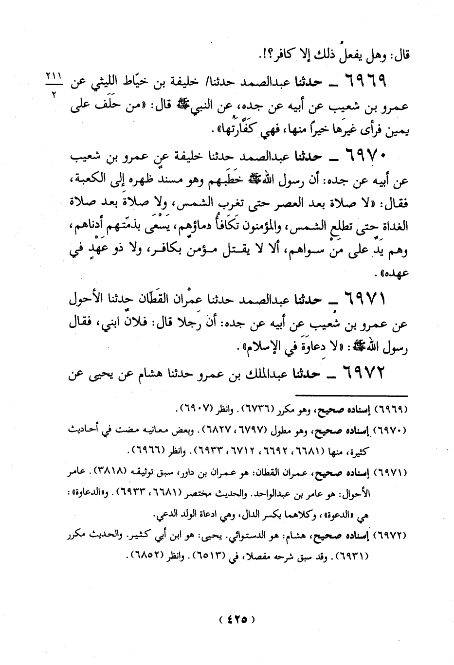 6970 - حدثنا عبد الصمد حدثنا خليفة عن عمرو بن شُعيب عن أبيه عن جده: أن رسول الله - صلى الله عليه وسلم - خَطهم وهو مسندٌ ظهره إلى الكعبة، فقال: "لا صلاة بعد العصر حتى تغرب الشمس، وِلاِ صلاةَ بعد صلاة الغداة حتى تطلِع الشمس، والمؤمنون تَكَافأُ دماؤهم، يسْعى بذمّتهم أدناهم، وهم يَدٌ على منْ سواهم، ألا لا يقتل مؤمنٌ بكافر، ولا ذو عَهْدٍ في عهده".