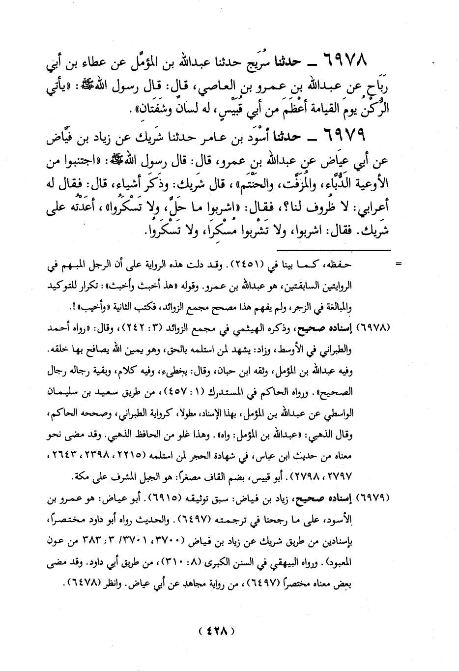 6978 - حدثنا سُرَيج حدثنا عبد الله بن المؤمِّل عن عطاء بن أبي ربَاح عن عبد الله بن عمرو بن العاصي، قال: قال رسول الله - صلى الله عليه وسلم -: "يأتي الرُّكْنُ يومَ القيامة أعْظَمَ من أبي قُبيسٍ، له لسانٌ وشَفَتانِ".