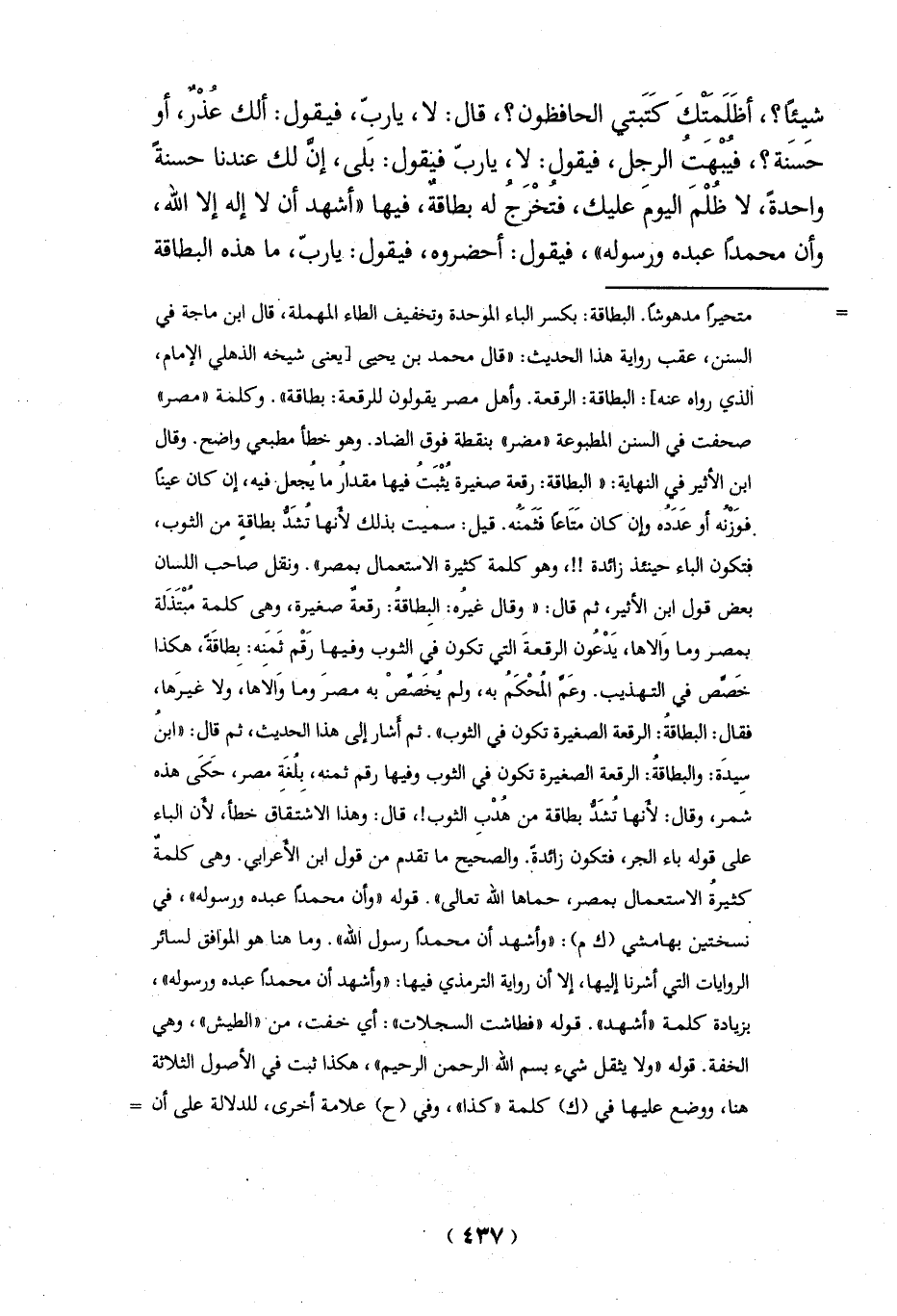 = متحيراً مدهوشًا. البطاقة: بكسر الباء الموحدة وتخفيف الطاء المهملة، قال ابن ماجة في السنن، عقب رواية هذا الحديث: "قال محمد بن يحيى [يعني شيخه الذهلى الإمام، الذي رواه عنه]: البطاقة: الرقعة. وأهل مصر يقولون للرقعة: بطاقة". وكلمة "مصر" صحفت في السنن المطوعة "مضر" بنقطة فوِق الضاد. وهو خطأ مطبعي واضح. وقال ابن الأثير في النهاية: "البطاقة: رقعة صغيرة يُثْبتُ فيها مقدارُ ما يُجعل. فيه، إن كان عينًا فوَزْنه أو عَدَدُه وإن كان مَتَاعًا فَثَمنُه. قيل: سميت بذلك لأنها تُشَدُّ بطاقةٍ من الثوب، فتكون الباء حينئذ زائدة!!، وهو كلمة كثيرة الاستعمال بمصر". ونقل صاحب اللسان بعض قول ابن الأثير، ثم قال: "وقال غيرُه: البِطاقةُ: رقعةٌ صغيرة، وهي كلمة مبْتَذَلة بمصر وما وَالاها، يَدْعُون الرقعةَ التي تكون فىِ الثوب وفيها رَقْم ثَمَنِه: بِطاقَة، هكذا خَصص في التهذيب. وعَم المُحْكَم به، ولم يُخَصِّصْ به مصرَ وما وَالاها، ولا غيرَها، فقال: البطاقةُ: الرقعة الصغيرة تكون في الثوب". ثم أشار إلى هذا الحديث، ثم قال: ابنُ سِيدَة: والبطاقةُ-: الرقعة الصغيرة تكون في الثوب وفيها رقم ثمنه، بِلُغَةِ مصر، حَكَى هذه شمر، وقال: لانها تُشَدُّ بطاقة من هُدْبِ الثوب، قال: وهذا الاشتقاق خطأ، لأن الباء على قوله باء الجر، فتكون زائدةً. والصحيح ما تقدم من قول ابن الأعرابي. وهي كلمةٌ كثيرُة الاستعمال بمصر، حماها الله تعالى". قوله وأن محمد، عبده ورسوله"، في نسختين بهامشي (ك م): "وأشهد أن محمد، رسول الله". وما هنا هو الموافق لسائر الروايات التي أشرنا إليها، إلا أن رواية الترمذي فيها: "واً شهد أن محمد، عبده ورسوله"، بزيادة كلمة "أشهد". قوله "فطاشت السجلات": أي خفت، منْ "الطيش"، وهي الخفة. قوله "ولا يثقل شيء بسم الله الرحمن الرحيم"، هكذا ثبت في الأصول الثلاثة هنا، ووضع عليها في (ك) كلمة "كذا"، وفى (ح) علامة أخرى، للدلالة على أن =