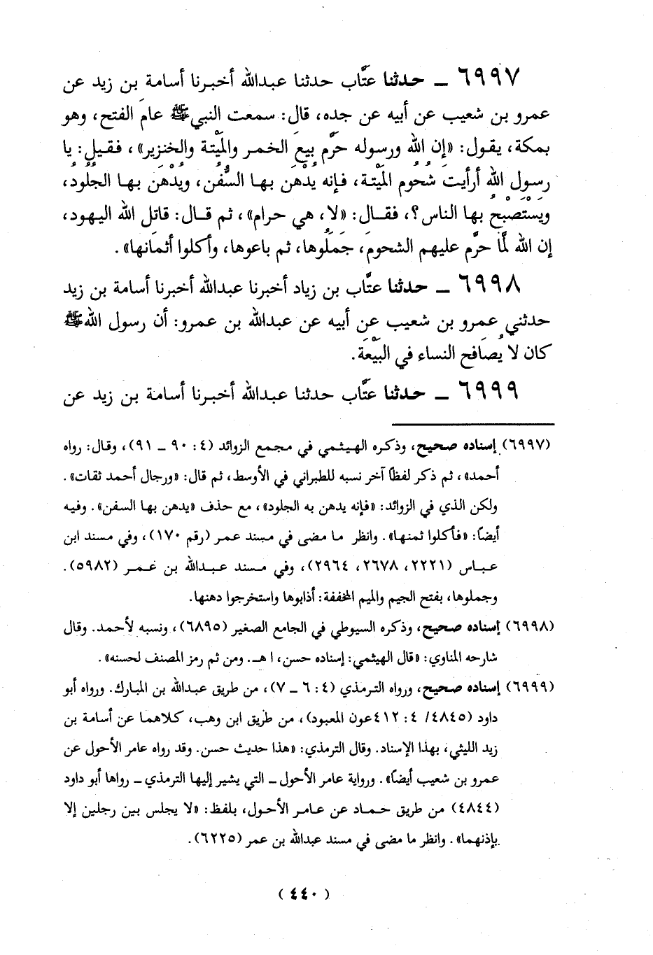 6997 - حدثنا عَتَّاب حدثنا عبد الله أخبرنا أسامة بن زيد عن عمرو بن شُعيب عن أبيه عن جده، قال: سمعت النبي - صلى الله عليه وسلم - عامَ الفتح، وهو بمكة، يقول: "إن الله ورسوله حَرَّم ييعَ الخمر والميتة والخنزِير"، فقيل: يا رسِوِل الله أرأيتَ شُحُوم الَمْيتة، فإنه يدْهن بها السُّفُن، ويدْهن بها الجُلُوُد، ويسْتصْبحُ بها الناس؟، فقال: "لا، هي حرام"، ثم قال: قاتل الله اليهود، إن الله لمَّا حرَّم عليهم الشحومَ، جَمَلُوها، ثم باعوها، وأكلوا أثمَانها".
