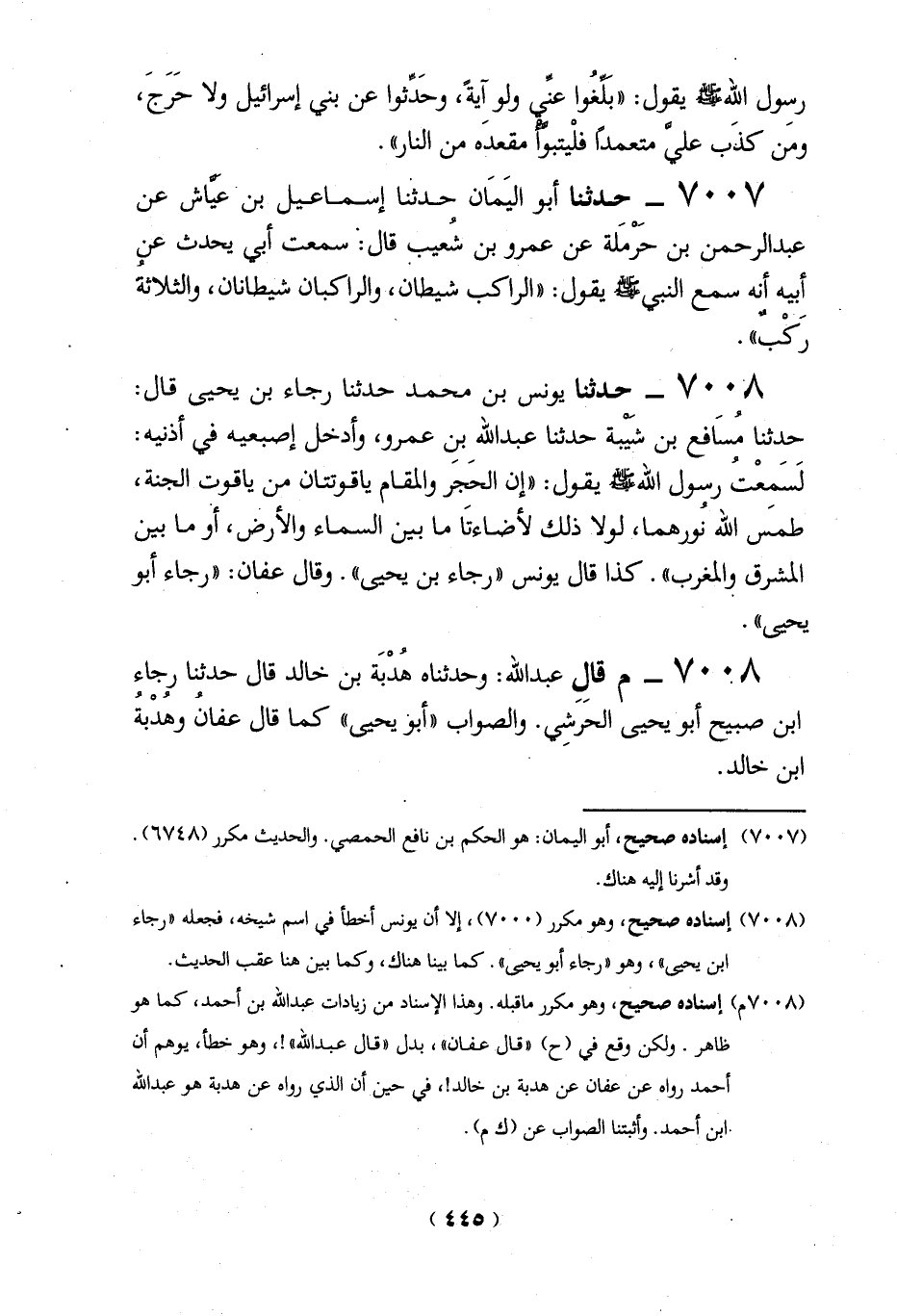 7008 - م قال عبد الله: وحدثناه هُدْبَة بن خالد قال حدثيا رجاء ابن صبيح أبو يحيى الحَرَشِي. والصواب "أبويحيى" كما قال عفان وهُدْبةُ ابن خالد.