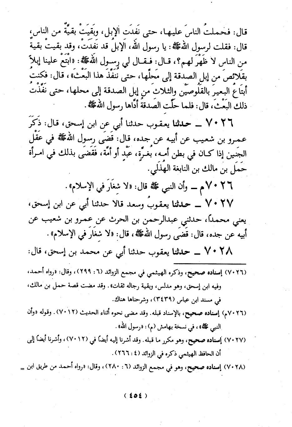 7026 - حدثنا يعقوب حدثنا أبي عنِ ابن إسحق، قال: ذَكر عمرو بن شُعيب عن أبيه عن جده، قال: قضى رسوِل الله - صلى الله عليه وسلم - في عَقْل الجَنين إذا كان في بطن أمه، بغرَّةٍ، عبدٍ أو أمَّة، فَقَضى بذلك في امرأة حَمَل بن مالك بن النابغة الهُذَلي.