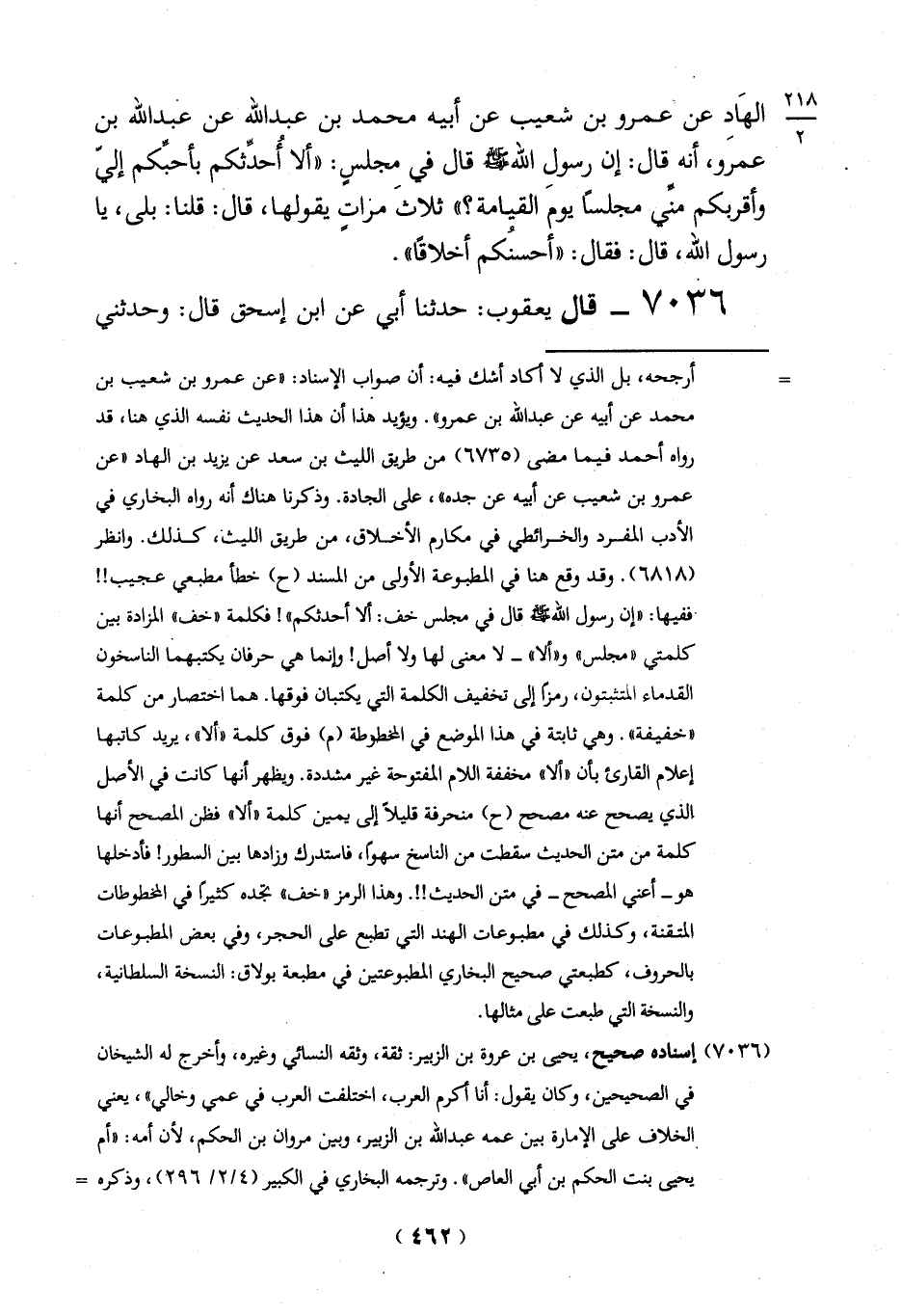 = أرجحه، بل الذي لا أكاد أشك فيه: أن صواب الإِسناد: "عن عمرو بن شُعيب بن محمَّد عن أبيه عن عبد الله بن عمرو". ويؤيد هذا أن هذا الحديث نفسه الذي هنا، قد رواه أحمد فيما مضى (6735) من طريق الليث بن سعد عن يزيد بن الهاد "عن عمرو بن شُعيب عن أبيه عن جده"، على العبادة. وذكرنا هناك أنه رواه البخاري في الأدب المفرد والخرائطي في مكارم الأخلاق، من طريق الليث، كذلك. وانظر (6818). وقد وقع هنا في المطبوعة الأولى من المسند (ح) خطأ مطبعي عجيب!! ففيها: "إن رسول الله - صلي الله عليه وسلم - قال في مجلس خف: ألا أحدثكم"! فكلمة "خف" المزادة بين كلمتي "مجلس" و"ألا" - لا معنى لها ولا أصل! وإنما هي حرفان يكتبهما الناسخون القدماء المتثبتون، رمزًا، إلى تخفيف الكلمة التي يكتبان فوقها. هما اختصار من كلمة "خفيفة". وهي ثابتة في هذا الموضع في المخطوطة (م) فوق كلمة "ألا"، يريد كاتبها إعلام القارئ بأن "ألا" مخففة اللام المفتوحة غير مشددة. ويظهر أنها كانت في الأصل الذي يصحح عنه مصح (ح) منحرفة قليلاً إلى يمين كلمة "ألا" فظن المصحح أنها كلمة من متن الحديث سقطت من الناسخ سهوًا، فاستدرك وزادها بين السطور! فأدخلها هو-أعنى المصحح- في متن الحديث!!. وهذا الرمز "خف" تجده كثير، في المخطوطات المتقنة، وكذلك في مطبوعات الهند التي تطع على الحجر، وفي بعض المطبوعات بالحروف، كطبعتي صحيح البخاري المطوعتين في مطبعة بولاق: النسخة السلطانية، والنسخة التي طبعت على مثالها.