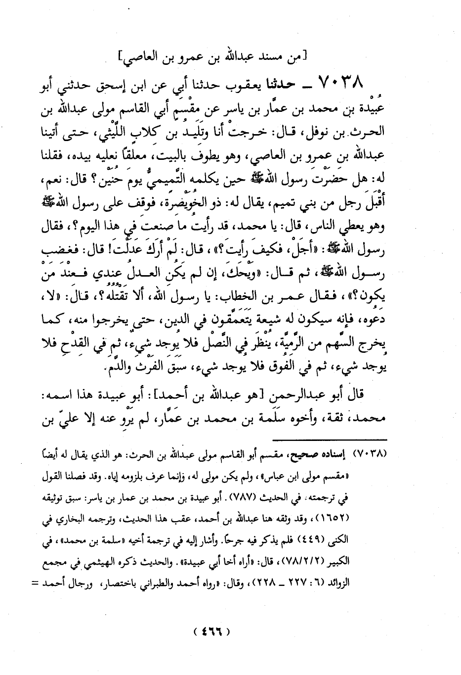 7038 - حدثنا يعقوب حدثنا أبي عن ابن إسحق حدثني أبو عبيْدة بن محمَّد بن عمَّار بن ياسر عن مقْسمٍ أبي القاسم مولى عبد الله بن الحرث. بن نوفل، قال: خرجتْ أنا وتَلِيد بن كلابٍ اللَّيْثى، حتى أتينا عبد الله بنِ عِمرِو بن العاصي، وهو يطوف بالبيت، معلقًا نعليه بيده، فقلنا له: هل حضرْت رسول الله -صلي الله عليه وسلم - حين يكلمه التّمِيميُّ يومَ حُنين؟ قال: نعم، أقْبَلَ رجل من بني تميم، يقال له: ذو الخُوَيْصِرة، فوقِف على رسول الله -صلي الله عليه وسلم - وهو يعطي الناس، قال: يا محمَّد، قد رأيت ماَ صنعت في هذا اليوم؟، فقال رسول الله -صلي الله عليه وسلم -: "أجَلْ، فكيفَ رأيتَ؟ "، قال: لَمْ أرَكَ عدلتَ! قال: فغضب رسول الله -صلي الله عليه وسلم -، ثم قال: "وَيْحَكَ، إن لم يَكنِ العدلُ عندي فعنْدَ من يكون؟ "، فقال عمر بن الخطاب: يا رسول الله، ألا تَقتلُهُ؟، قالَ: "لا، دَعُوه، فإنه سيكون له شيعة يَتَعَمَّقون في الدين، حتى يخرجوا منه، كما يخرج السَّهم من الرَّمِيَّة، يُنْظر في النَّصْل فلا يُوجد شيءٌ، ثمْ في القدْحِ فلا يُوجد شيء، ثم في الفوق فلا يوجد شيء، سَبَقَ الفَرْث والدَّم.