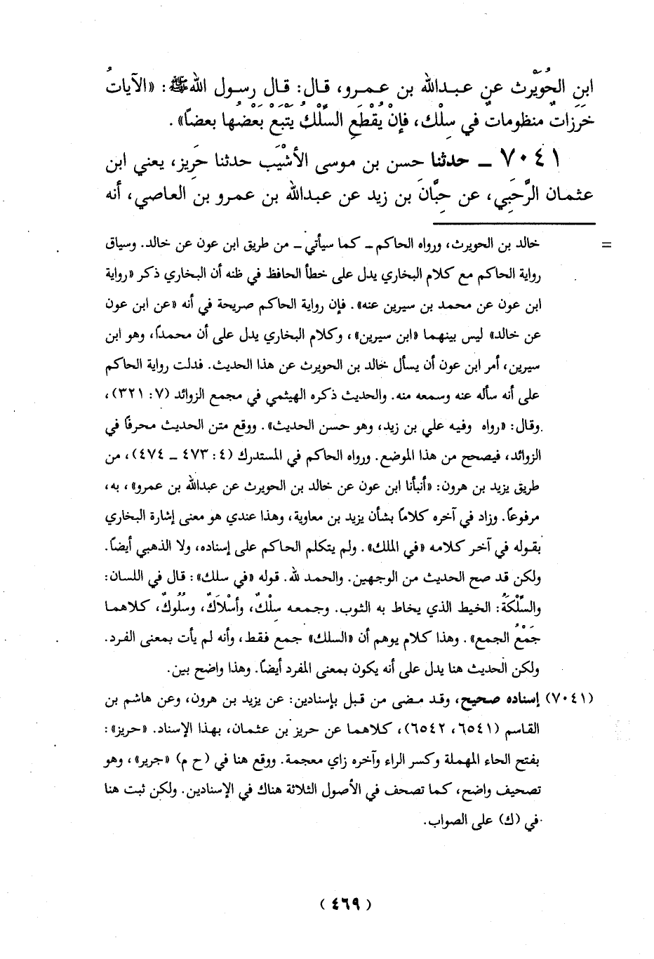(7041) إسناده صحيح، وقد مضى من قبل بإسنادين: عن يزيد بن هرون، وعن هاشم بن القاسم (6541، 6542)، كلاهما عن حريز بن عثمان، بهذا الإِسناد. "حريز": بفتح الحاء المهملة وكسرالراء وآخره زاي معجمة. ووقع هنا في (ح م) "جرير"، وهو تصحيف واضح، كما تصحف في الأصول الثلاثة هناك في الإسنادين. ولكن ثبت هنا في (ك) على الصواب.