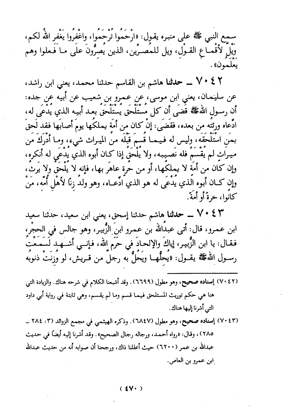 (7042) إسناده صحيح، وهو مطول (6699). وقد أشبعنا الكلام في شرحه هناك. والزيادة التي هنا هي حكم توريث المستلحق فيما قسم وما لم يقسم، وهي ثابتة في رواية أبي داود التي أشرنا إليها هناك.