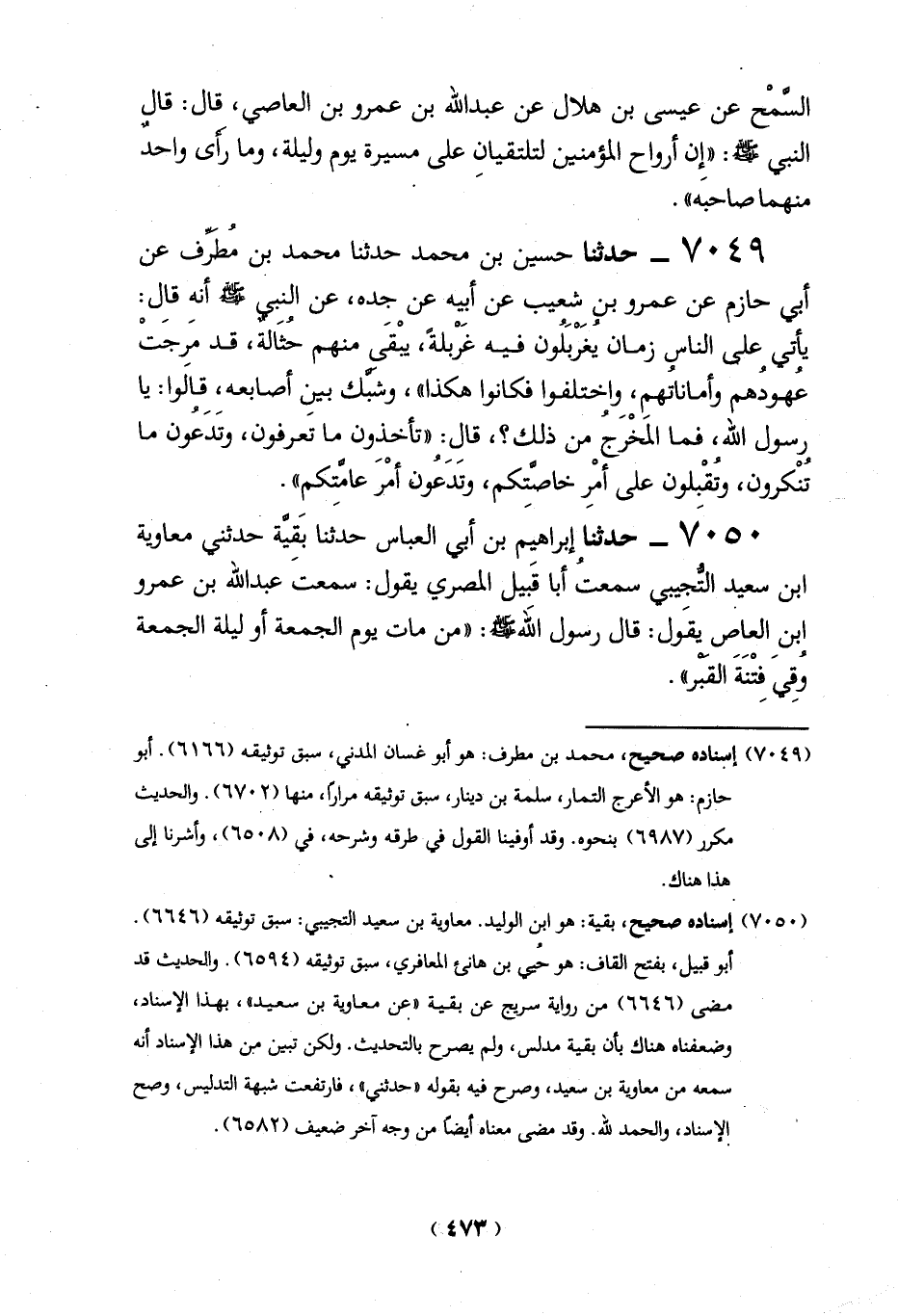 7050 - حدثنا إبراهيم بن أبي العباس حدثنا بَقِيَّة حدثني معاوية ابن سعيد التُّجيبي سمعتُ أبا قَبيل المصري يقول: سمعت عبد الله بن عمرو ابن العاص يقَول: قال رسول الله -صلي الله عليه وسلم -: "من مات يوم الجمعة أو ليلة الجمعة وُقِيَ فِتْنَةَ القَبْر".