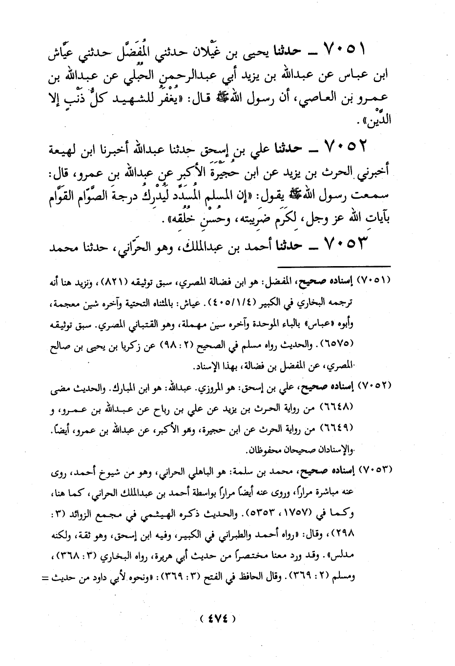 7051 - حدثنا يحيى بن غَيْلان حدثني المُفَضَّلْ حدثني عيَّاش ابن عباس عن عبد الله بن يزيد أبي عبد الرحمن الحُبُلي عن عبد الله بن عمرو بن العاصي، أن رسول الله -صلي الله عليه وسلم - قال: "يُغْفَرُ للشهيد كلُّ ذنبٍ إلا الدَّيْن".