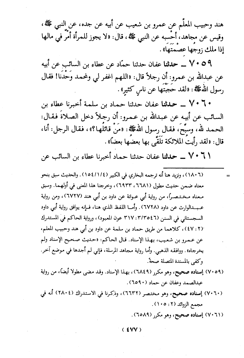 7059 - حدثنا عفان حدثنا حمّاد عن عطاء بن السائب عن أبيه عن عبد الله بن عمرو: أن رجلاً قال: "اللهم اغفر لي ولمحمد وَحْدَنا! فقال رسول الله -صلي الله عليه وسلم -: "لقد حَجتَها عن ناسٍ كثيرٍ".