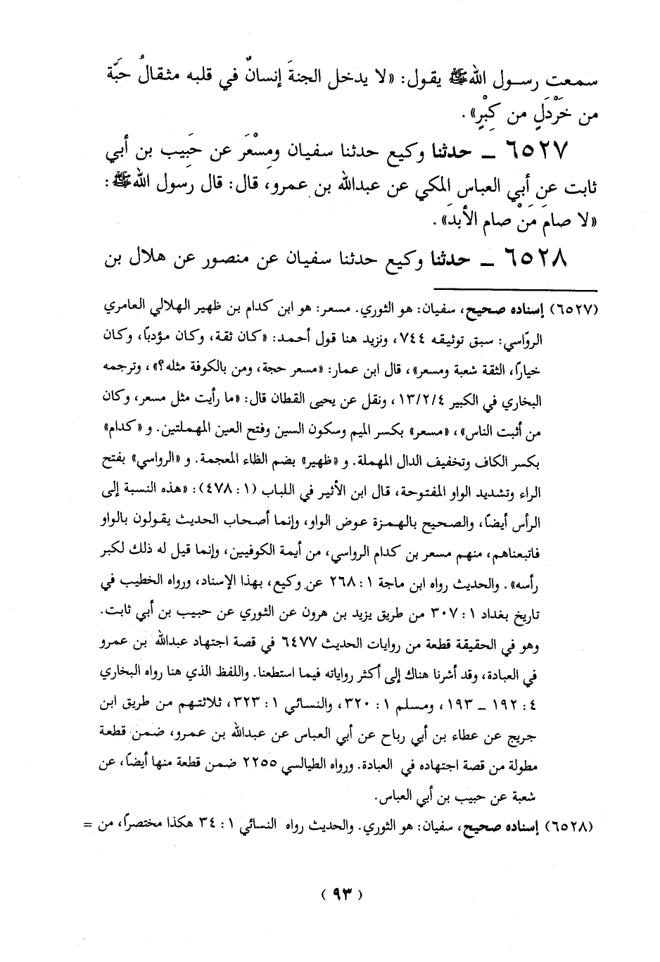 (6527) إسناده صحيح، سفيان: هو الثوري. مسعر: هو ابن كدام بن ظهير الهلالي العامري الروّاسي: سبق توثيقه 744، ونزيد هنا قول أحمد: "كان ثقة، وكان مؤدباً، وكان خياراً، الثقة شُعبة ومسعر"، قال ابن عمار: "مسعر حجة، ومن بالكوفة مثله؟ "، وترجمه البخاري في الكبير 4/ 2/13، ونقل عن يحيى القطان قال: "ما رأيت مثل مسعر، وكان من أثبت الناس"، "مسعر" بكسر الميم وسكون السين وفتح العين المهملتين. و"كدام" بكسر الكاف وتخفيف الدال المهملة. و"ظهير" بضم الظاء المعجمة. و"الرواسي" بفتح الراء وتشديد الواو المفتوحة، قال ابن الأثير في اللباب (1: 478): "هذه النسبة إلى الرأس أيضاً، والصحيح بالهمزة عوض الواو، وإنما أصحاب الحديث يقولون بالواو