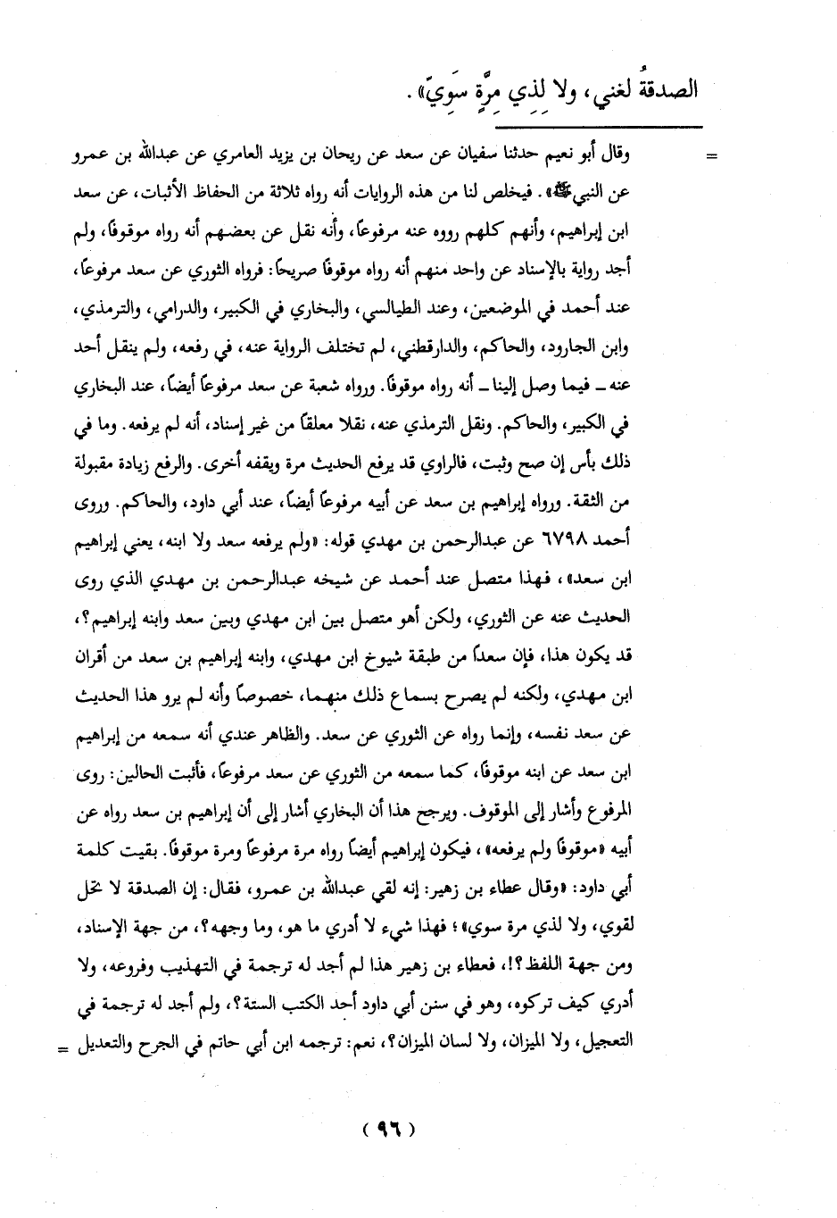 = وقال أبو نعيم حدثنا سفيان عن سعد عن ريحان بن يزيد العامري عن عبد الله بن عمرو عن النبي -صلي الله عليه وسلم -". فيخلص لنا من هذه الروايات أنه رواه ثلاثة من الحفاظ الأثبات، عن سعد ابن إبراهيم، وأنهم كلهم رووه عنه مرفوعاً، وأنه نقل عن بعضهم أنه رواه موقوفاً، ولم أجد رواية بالإسناد عن واحد منهم أنه رواه موقوفاً صريحاً: فرواه الثوري عن سعد مرفوعاً، عند أحمد في الموضعين، وعند الطيالسي، والبخاري في الكبير، والدرامي، والترمذي، وابن الجارود، والحاكم، والدارقطني، لم تختلف الرواية عنه، في رفعه، ولم ينقل أحد عنه - فيما وصل إلينا- أنه رواه موقوفاً. ورواه شُعبة عن سعد مرفوعاً أيضاً، عند البخاري في الكبير، والحاكم. ونقل الترمذي عنه، نقلا معلقاً من غير إسناد، أنه لم يرفعه. وما في ذلك بأس إن صح وثبت، فالراوي قد يرفع الحديث مرة ويقفه أخرى. والرفع زيادة مقبولة من الثقة. ورواه إبراهيم بن سعد عن أبيه مرفوعاً أيضاً، عند أبي داود، والحاكم. وروى أحمد 6798 عن عبد الرحمن بن مهدي قوله: "ولم يرفعه سعد ولا ابنه، يعني إبراهيم ابن سعد"، فهذا متصل عند أحمد عن شيخه عبد الرحمن بن مهدي الذي روى الحديث عنه عن الثوري، ولكن أهو متصل بين ابن مهدي وبين سعد وابنه إبراهيم؟، قد يكون هذا، فإن سعداً من طبقة شيوخ ابن مهدي، وابنه إبراهيم بن سعد من أقران ابن مهدي، ولكنه لم يصرح بسماع ذلك منهما، خصوصاً وأنه لم يرو هذا الحديث عن سعد نفسه، وإنما رواه عن الثوري عن سعد. والظاهر عندي أنه سمعه من إبراهيم ابن سعد عن ابنه موقوفاً، كما سمعه من الثوري عن سعد مرفوعاً، فأثبت الحالين: روى المرفوع وأشار إلى الموقوف. ويرجح هذا أن البخاري أشار إلى أن إبراهيم بن سعد رواه عن أبيه "موقوفاً ولم يرفعه"، فيكون إبراهيم أيضاً رواه مرة مرفوعاً ومرة موقوفاً. بقيت كلمة أبي داود: "وقال عطاء بن زهير: إنه لقي عبد الله بن عمرو، فقال: إن الصدقة لا تحل لقوي، ولا لذي مرة سوي"؛ فهذا شيء لا أدري ما هو، وما وجهه؟، من جهة الإسناد، ومن جهة اللفظ؟!، فعطاء بن زهير هذا لم أجد له ترجمة في التهذيب وفروعه، ولا أدري كيف تركوه، وهو في سنن أبي داود أحد الكتب الستة؟، ولم أجد له ترجمة في التعجيل، ولا الميزان، ولا لسان الميزان؟، نعم: ترجمه ابن أبي حاتم في الجرح والتعديل =