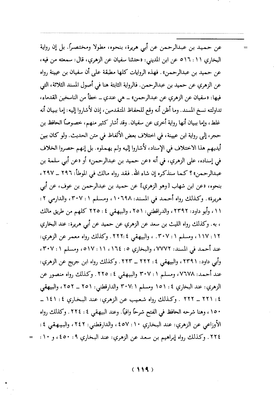 = عن حميد بن عبد الرحمن عن أبي هريرة، بنحوه، مطولا ومختصرًا. بل إن رواية البخاري 11: 516 عن ابن المديني: "حدثنا سفيان عن الزهري، قال: سمعته من فيه، عن حميد بن عبد الرحمن". فهذه الروايات كلها مطبقة على أن سفيان بن عيينة رواه عن الزهري عن حميد بن عبد الرحمن. فالرواية الثابتة هنا في أصول المسند الثلاثة، التي فيها: "سفيان عن الزهري عن عبد الرحمن"- هي عندي- خطأ من الناسخين القدماء، تداولته نسخ المسند. وما أظن أنه وقع للحفاظ المتقدمين، إذن لأشاروا إليه: إما ببيان أنه غلط، وإما ببيان أنها رواية أخرى عن سفيان. وقد أشار كثير منهم، خصوصاً الحافظ بن حجر، إلى رواية ابن عيينة، في اختلاف بعض الألفاظ في متن الحديث. ولو كان بين أيديهم هذا الاختلاف في الإِسناد، لأشاروا إليه ولم يهملوه. بل إنهم حصروا الخلاف في إسناده، على الزهري، في أنه "عن حميد بن عبد الرحمن" أو "عن أبي سلمة بن عبد الرحمن"؟ كما سنذكره إن شاء الله. فقد رواه مالك في الموطأ: 296 - 297، بنحوه، "عن ابن شهاب [وهو الزهري] عن حميد بن عبد الرحمن بن عوف، عن أبي هريرة". وكذلك رواه أحمد في المسند: 10698، ومسلم 1: 307، والدارمي 2: 11، وأبو داود: 2392، والدراقطنى: 251، والبيهقي 4: 225 كلهم من طريق مالك، به. وكذلك رواه الليث بن سعد عن الزهري عن حميد عن أبي هريرة: عند البخاري 12: 117، ومسلم 1: 307.، والبيهقي 222:4. وكذلك رواه معمر عن الزهري: عند أحمد في المسند: 7772، والبخاري 5: 164، 11: 517، ومسلم 1: 307، وأبي داودة 2391، والبيهقي 4: 222 - 223. وكذلك رواه ابن جُريج عن الزهري: عند أحمد: 7678، ومسلم 1: 307 والبيهقي 4: 225. وكذلك رواه منصور عن الزهري: عند البخاري 4: 151 ومسلم 1: 307 والدارقطني: 251 - 252، والبيهقي 4: 221 - 222 وكذلك رواه شُعيب عن الزهري: عند البخاري 4: 141 - 150، وهنا شرحه الحافظ في الفتح شرحًا وافيَا. وعند البيهقي 4: 224. وكذلك رواه الأوزاعي عن الزهري: عند البخاري 10: 457، والدارقطني: 242، والبيهقي 4: 224. وكذلك رواه إبراهيم بن سعد عن الزهري: عند البخاري 9: 450، و 10: =