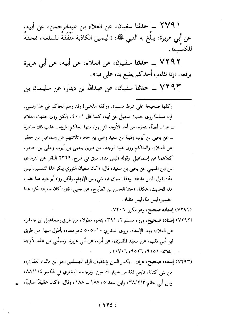فإن مسلمًا روى حديث سهيل عن أبيه، كما قال 1: 40. ولكن روى حديث العلاء - هذا - أيضاً، بنحوه، من أحد الأوجه التي رواه منها الحاكم: فرواه - عقب ذاك مباشرة - عن يحيى بن أيوب وقتيبة بن سعيد وعلي بن حجر، ثلاثتهم عن إسماعيل بن جعفر عن العلاء. والحاكم روى هذا الوجه، من طريق يحيى بن أيوب وعلي بن حجر، كلاهما عن إسماعيل. وقوله "ليس منا": سبق في شرح: 2329 النقل عن الترمذي عن ابن المديني عن يحيى بن سعيد، قال: "كان سفيان الثوري ينكر هذا التفسير: ليس منا: يقول: ليس مثلنا". وهذا السياق فيه ضىء من الإيهام. ولكن رواه أبو داود هنا عقب هذا الحديث، هكذا: "حثنا الحسن بن الصّباح، عن يحيى، قال: كان سفيان يكره هذا التفسير: ليس منّا، ليس مثلنا".