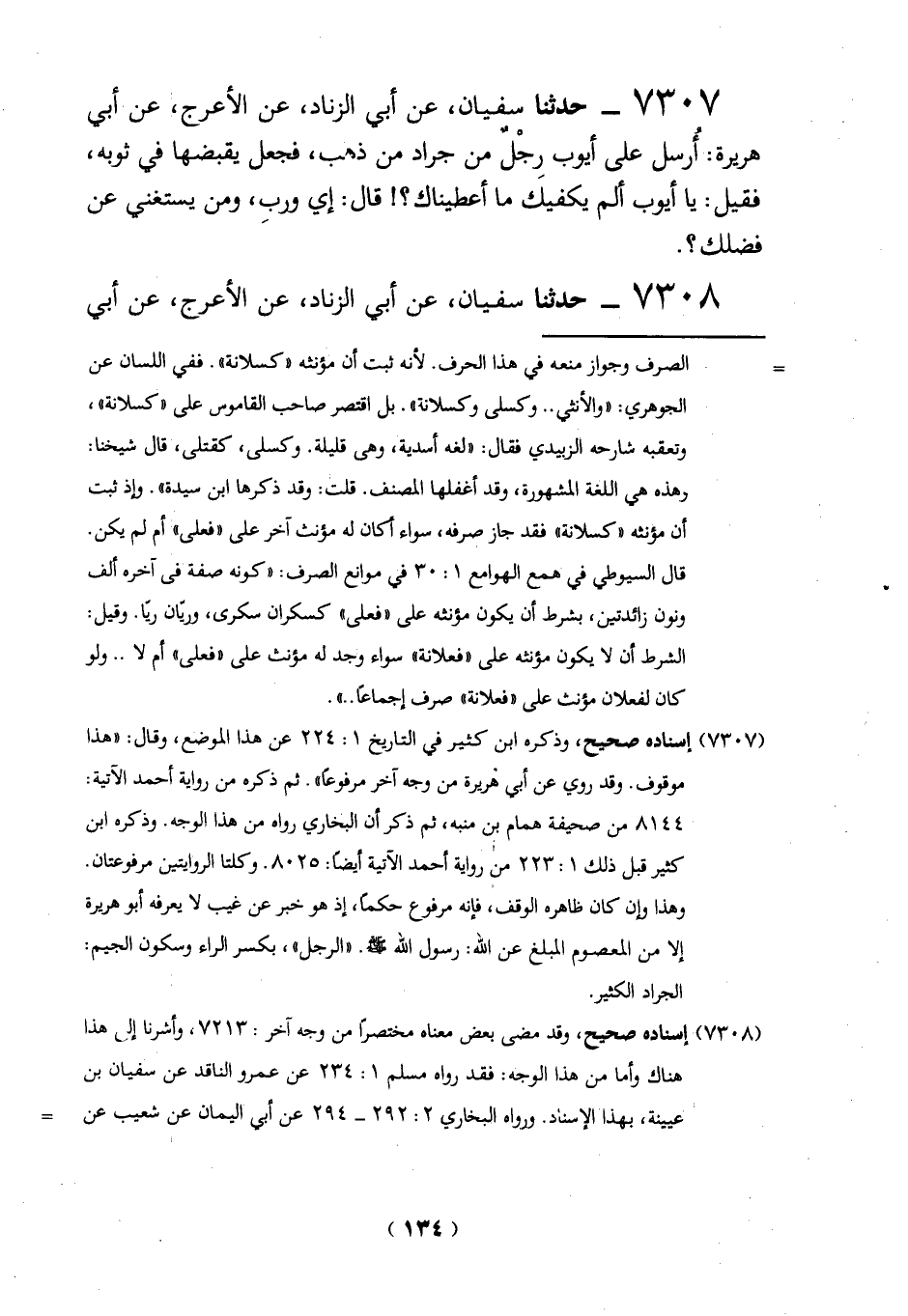 7307 - حدثنا سفيان، عن أبي الزناد" عن الأعرج، عن أبي هريرة: أُرسل على أيوب رِجْلٌ من جراد من ذهب، فجعل يقبضها في ثوبه، فقيل: يا أيوب ألم يكفيك ما أعطيناك؟! قال: إي وربِ، ومن يستغنى عن فضلك؟.