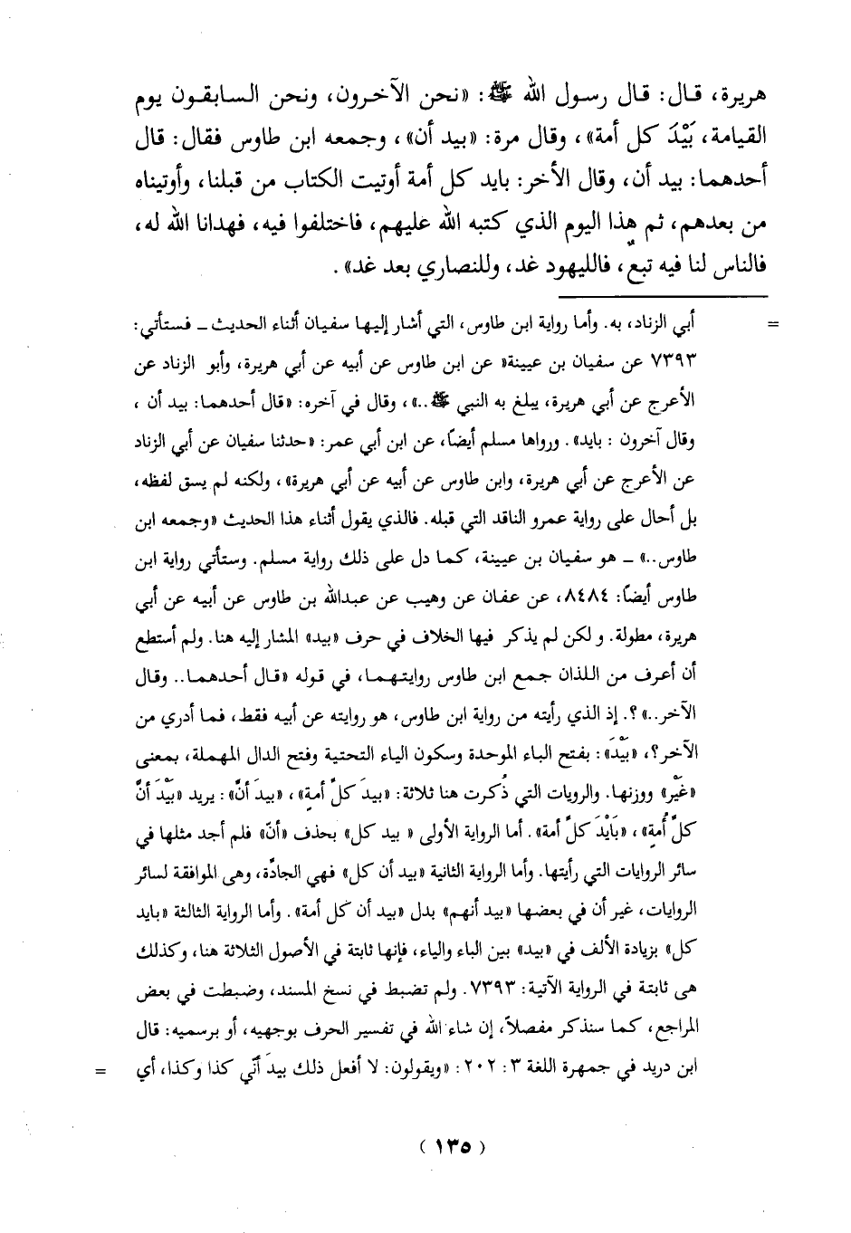 أن أعرف من اللذان جمع ابن طاوس روايتهما، في قوله "قال أحدهما .. وقال الآخر .. "؟. إذ الذي رأيته من رواية ابن طاوس، هو روايته عن أبيه فقط، في أدري من الآخر؟، "بَيْدَ": بفتح الباء الموحدة وسكون الياء التحتية وفتح الدال المهملة، بمعنى "غير" ووزنها. والرويات التي ذُكرت هنا ثلاثة: "بيدَ كلِّ أمةٍ"، "بيدَ أنَّ": يريد "بَيْدَ أنَّ كلً أُمةٍ"، "بَايْدَ كلً أمة". أما الرواية الأولى "بيد كل" بحذف "أنّ" فلم أجد مثلها في سائر الروايات التي رأيتها. وأما الرواية الثانية "بيد أن كل" فهي الجادَّة، وهي الموافقة لسائر الروايات، غير أن في بعضها "بيد أنهم" بدل "بيد أن كل أمة". وأما الرواية الثالثة "بايد