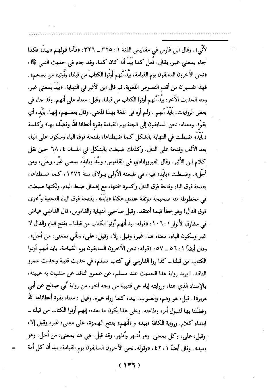 وقال أيضاً 1: 56 - 57: "قوله: نحن الآخرون السابقون يوم القيامة، بايد أنهم أوتوا الكتاب من قبلنا- كذا روا الفارسي في كتاب مسلم، في حديث قتيبة وحديث عمرو الناقد. [يريد رواية هذا الحديث عند مسلم، عن عمرو الناقد عن سفيان به عيينة، بالإسناد الذي هنا، وروايته إياه عن قتيبة من وجه آخر، من رواية أبي صالح عن أبي هريرة]. قيل: هو وهم، والصواب: بيد، كما رواه غيره. وقيل: معناه بقوة أعطاناها الله وفضّلنا بها لقبول أمره وطاعته. وعلى هذا يكون ما بعده: إنهم أوتوا الكتاب من قبلنا - ابتداء كلام. ورواية الكافة "بيد" و"أنهم" بفتح الهمزة، على معنى: غير، وقيل إلا،