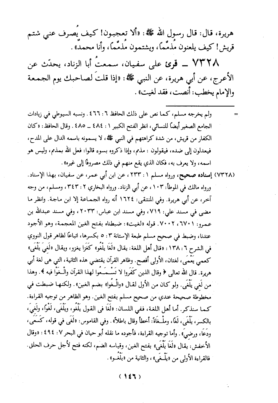 7328 - قرئ على سفيان، سمعتُ أبا الزناد، يحدّث عن الأعرج، عن أبي هريرة، عن النبي -صلي الله عليه وسلم -: "إذا قلتَ لصاحبك يوم الجمعة والإمام يخطب: أنصت، فقد لغيت".