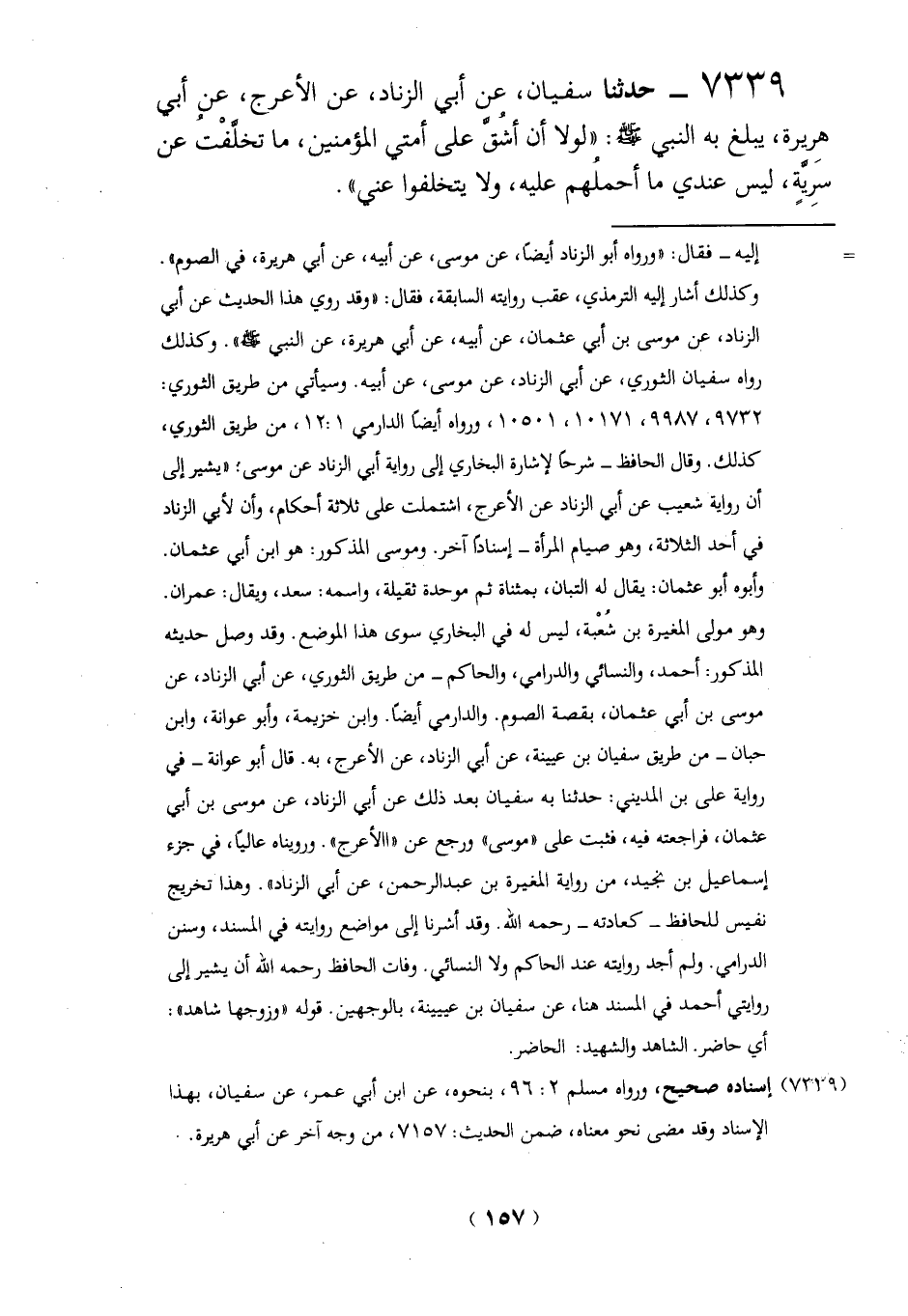 7339 - حدثنا سفيان، عن أبي الزناد، عن الأعرج، في أبي هِريرة، يبلغ به النبي -صلي الله عليه وسلم -: "لولا أن أشقَّ على أمتي المؤمنين، ما تخلَّفْتُ عن سرِّيةٍ، ليس عندي ما أحملُهم عليه، ولا يتخلفوا عني".