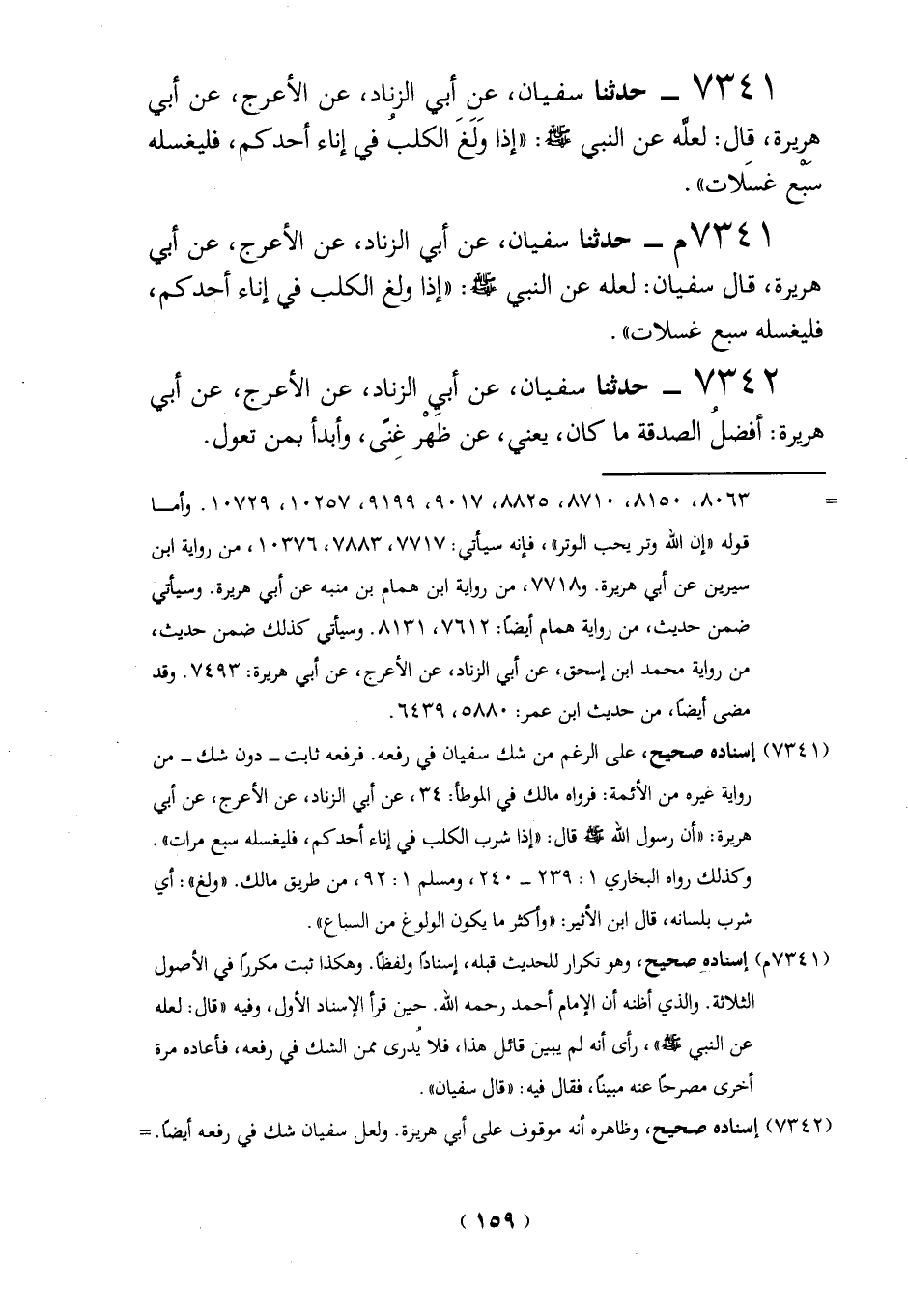 7341 م- حدثنا سفيان، عن أبي الزناد، عن الأعرج، عن أبي هريرة، قال سفيان: لعله عن النبي -صلي الله عليه وسلم -: "إذا ولغ الكلب في إناء أحدكم، فليغسله سبع غسلات".