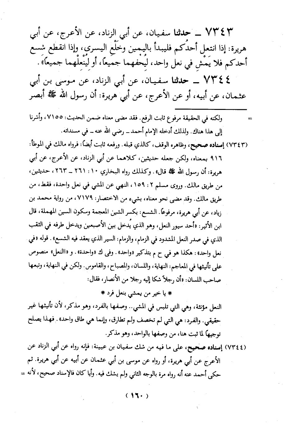 7343 - حدثنا سفيان، عن أبي الزناد، عن الأعرج، عن أبي هريرة: إذا انتِعل أحدُكم فليبدأ باليمين وخَلْعِ اليسرى، وإذا انقطع شسع أحدكم فلا يمْشِ في نعل واحد، ليُحْفهما جميعاً، أو لِيُنْعِلْهما جميعاً".