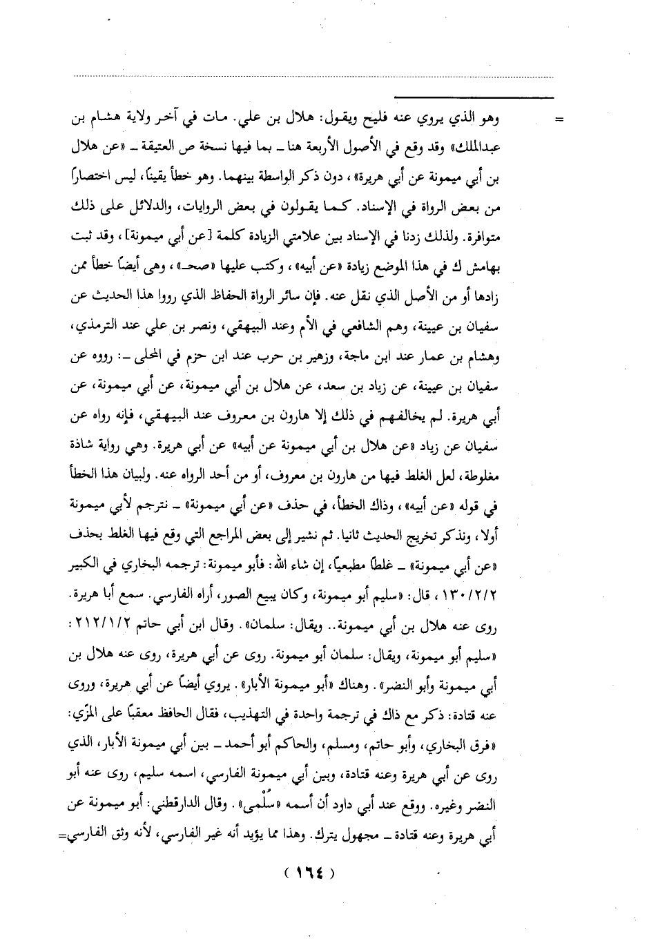 = وهو الذي يروي عنه فليح ويقول: هلال بن علي. مات في آخر ولاية هشام بن عبد الملك" وقد وقع في الأصول الأربعة هنا- بما فيها نسخة ص العتيقة- "عن هلا بن أبي ميمونة عن أبي هريرة"، دون ذكر الواسطة بينهما. وهو خطأ يقيناً، ليس اختصارًا من بعض الرواة في الإِسناد. كما يقولون في بعض الروايات، والدلائل على ذلك متوافرة. ولذلك زدنا في الإِسناد بين علامتي الزيادة كلمة [عن أبي ميمونة]، وقد ثبت بهامش ك في هذا الموضع زيادة "عن أبيه"، وكتب عليها "صح"، وهي أيضاً خطأ ممن زادها أو من الأصل الذي نقل عنه. فإن سائر الرواة الحفاظ الذي رووا هذا الحديث عن سفيان بن عيينة، وهم الشافعي في الأم وعند البيهقي، ونصر بن علي عند الترمذي، وهشام بن عمار عند ابن ماجة، وزهير بن حرب عند ابن حزم في المحلى-: رووه عن سفيان بن عيينة، عن زياد بن سعد، عن هلا بن أبي ميمونة، عن أبي ميمونة، عن أبي هريرة. لم يخالفهم في ذلك إلا هارون بن معروف عند البيهقي، فإنه رواه عن سفيان عن زياد "عن هلا بن أبي ميمونة عن أبيه" عن أبي هريرة. وهي رواية شاذة مغلوطة، لعل الغلط فيها من هارون بن معروف، أو من أحد الرواه عنه. ولبيان هذا الخطأ في قوله "عن أبيه"، وذاك الخطأ، في حذف "عن أبي ميمونة" - نترجم لأبي ميمونة أولاً، ونذكر تخريج الحديث ثانيا. ثم نشير إلى بعض المراجع التي وقع فيها الغلط بحذف "عن أبي ميمونة"- غلطاً مطبعيًا، إن شاء الله: فأبو ميمونة: ترجمه البخاري في الكبير 2/ 2/ 130، قال: "سليم أبو ميمونة، وكان يبيع الصور، أراه الفارسي. سمع أبا هريرة.