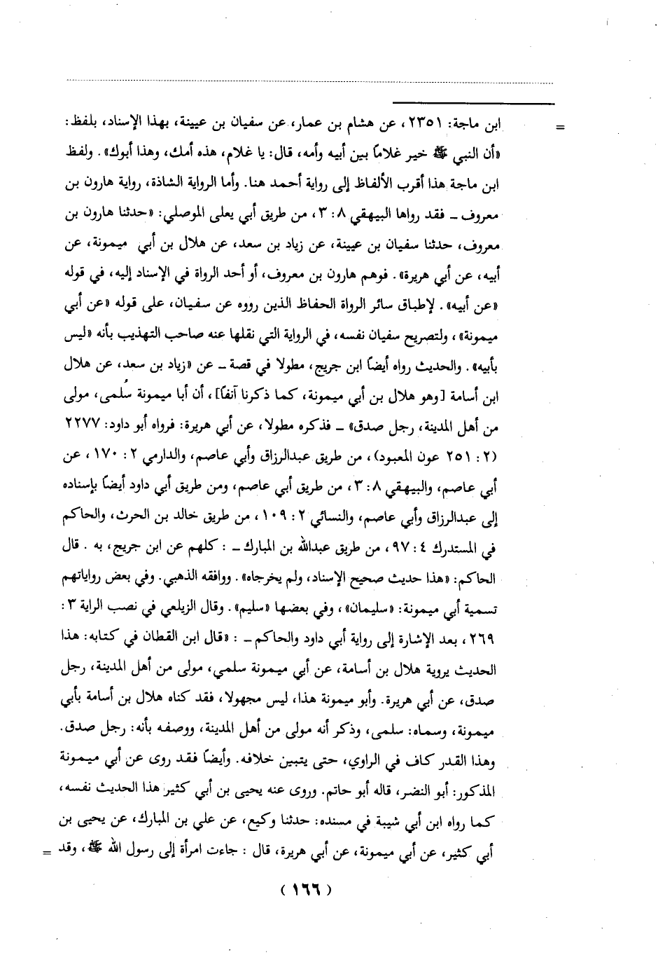 = ابن ماجة: 2351، عن هشام بن عمار، عن سفيان بن عيينة، بهذا الإسناد، بلفظ: "أن النبي -صلي الله عليه وسلم - خير غلامًا بين أبيه وأمه، قال: يا غلام، هذه أمك، وهذا أبوك". ولفظ ابن ماجة هذا أقرب الألفاظ إلى رواية أحمد هنا. وأما الرواية الشاذة، رواية هارون بن معروف- فقد رواها البيهقي 8: 3، من طريق أبي يعلى الموصلي: "حدثنا هارون بن معروف، حدثنا سفيان بن عيينة، عن زياد بن سعد، عن هلال بن أبي ميمونة، عن أبيه، عن أبي هريرة". فوهم هارون بن معروف، أو أحد الرواة في الإسناد إليه، في قوله "عن أبيه". لإطباق سائر الرواة الحفاظ الذين رووه عن سفيان، على قوله "عن أبي ميمون"، ولتصريح سفيان نفسه، في الرواية التي نقلها عنه صاحب التهذيب بأنه "ليس بأبيه". والحديث رواه أيضاً ابن جُريج، مطولا في قصة - عن "زياد بن سعد، عن هلال ابن أسامة [وهو هلال بن أبي ميمونة، كما ذكرنا آنفًا]، أن أبا ميمونة سُلمى، مولى من أهل المدينة، رجل صدق" - فذكره مطولاً، عن أبي هريرة: فرواه أبو داود: 2277 (2: 251 عون المعبود)، من طريق عبد الرزاق وأبي عاصم، والدارمي 2: 170، عن أبي عاصم، والبيهقي 8: 3، من طريق أبي عاصم، ومن طريق أبي داود أيضاً بإسناده إلى عبد الرزاق وأبي عاصم، والنسائي 2: 109، من طريق خالد بن الحرث، والحاكم في المستدرك 4: 97، من طريق عبد الله بن المبارك -: كلهم عن ابن جُريج، به. قال الحاكم: "هذا حديث صحيح الإسناد، ولم يخرجاه". ووافقه الذهبي. وفي بعض رواياتهم تسمية أبي ميمونة: "سليمان"، وفي بعضها "سليم". وقال الزيلعي في نصب الراية 3: 269، بعد الإشارة إلى رواية أبي داود والحاكم-: "قال ابن القطان في كتابه: هذا الحديث يروية هلال بن أسامة، عن أبي ميمونة سلمي، مولى من أهل المدينة، رجل صدق، عن أبي هريرة. وأبو ميمونة هذا، ليس مجهولا، فقد كناه هلال بن أسامة بأبي ميمونة، وسماه: سلمى، وذكر أنه مولى من أهل المدينة، ووصفه بأنه: رجل صدق.