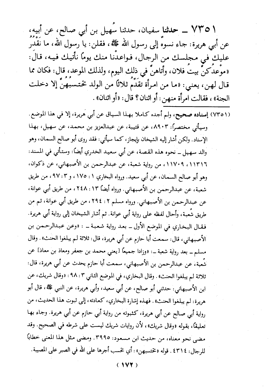 7351 - حَدَّثَنَا سُفْيَانُ، حَدَّثَنَا سُهَيْلُ بْنُ أَبِي صَالِحٍ، عَنْ أَبِيهِ، عَنْ أَبِي هُرَيْرَةَ: جَاءَ نِسْوَةٌ إِلَى رَسُولِ الله -صلى الله عليه وسلم- فَقُلْنَ: يَا رَسُولَ الله، مَا نَقْدِرُ عَلَيْكَ فِي مَجْلِسِكَ مِنَ الرِّجَالِ، فَوَاعِدْنَا مِنْكَ يَوْماً نَأْتِيكَ فِيهِ، قَالَ: "مَوْعِدُكُنَّ بَيْتُ فُلاَنٍ، وَأَتَاهُنَّ فِي ذَلِكَ الْيَوْمِ، وَلِذَلِكَ الْمَوْعِدِ، قَالَ: فَكَانَ مِمَّا قَالَ لَهُنَّ، يَعْنِى: "مَا مِنِ امْرَأَةٍ تُقَدِّمُ ثَلاَثاً مِنَ الْوَلَدِ تَحْتَسِبُهُنَّ إِلاَّ دَخَلْتِ الْجَنَّةَ". فَقَالَتِ امْرَأَةٌ مِنْهُنَّ: أَوِ اثْنَانِ؟ قَالَ: "أَوِ اثْنَانِ".