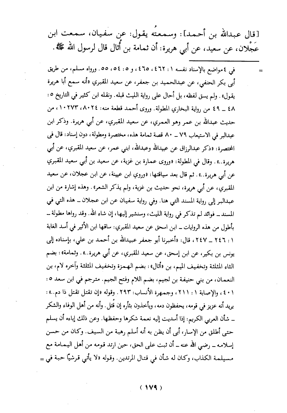 [قال عبد الله بن أحمد]: وسمعتُه يقول: في سفيان، سمعت ابن عَجْلان، عن سعيد، عن أبي هريرة: أن ثمامة بن أُثال قال لرسول الله -صلي الله عليه وسلم -.