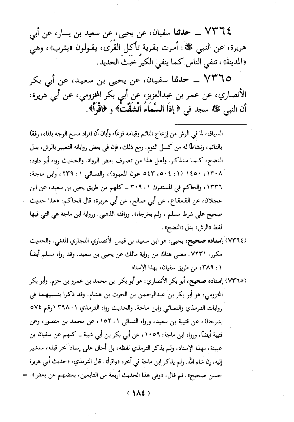 7365 - حدثنا سفيان، عن يحيى بن سعيد، عن أبي بكر الأنصاري، عن عمر بن عبد العزيز، عن أبي بكر المخزومي، عن أبي هريرة: أن النبي -صلي الله عليه وسلم - في {إِذَا السَّمَاءُ انْشَقَّتْ} و {اقْرَأْ}.