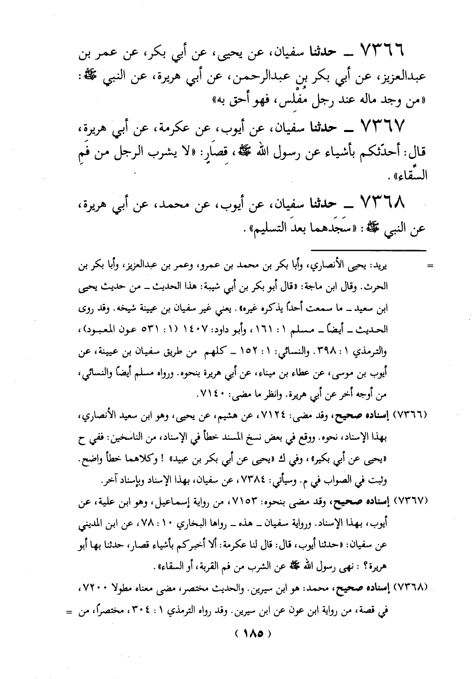 7366 - حدثنا سفيان، عن يحيى، عن أبي بكر، عن عمر بن عبد العزيز، عن أبي بكر بين عبد الرحمن، عن أبي هريرة، عن النبي -صلي الله عليه وسلم -: "من وجد ماله عند رجل مفْلِس، فهوأحق به"