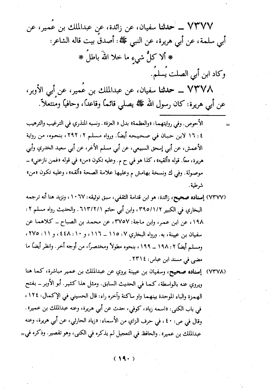 7377 - احدشا سفيان، عن زائدة، في عبد الملك بن عُمير، عن أبي سلمة، عن أبي هريرة، عن النبي -صلي الله عليه وسلم -: أصدقُ بيت قاله الشاعر: