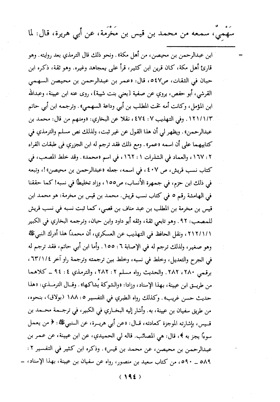 = ابن عبد الرحمن بن محيصن، من أهل مكة". ونحو ذلك قال الترمذي بعد روايته. وهر قارئ أهل مكة، كان قرين ابن كثير، قرأ على مجاهد وغيره. وهو ثقة، ذكره ابن حبان في الثقات، ص 547، قال: "عمر بن عبد الرحمن بن محيصن السهمي القرشي، أبو حفص، يروي عن صفية [يعني بنت شيبة]، روى عنه ابن عيينة، وعبد الله ابن المؤمل، وكانت أمه تحت المطلب بن أبي وداعة السهمي". وترجمه ابن أبي حاتم 3/ 1/ 121. وفي التهذيب 7: 474، نقلا عن البخاري: "ومنهم من قال: محمَّد بن عبد الرحمن". ويظهر لي أن هذا القول عن غير ثبت، ولذلك نص مسلم والترمذي في