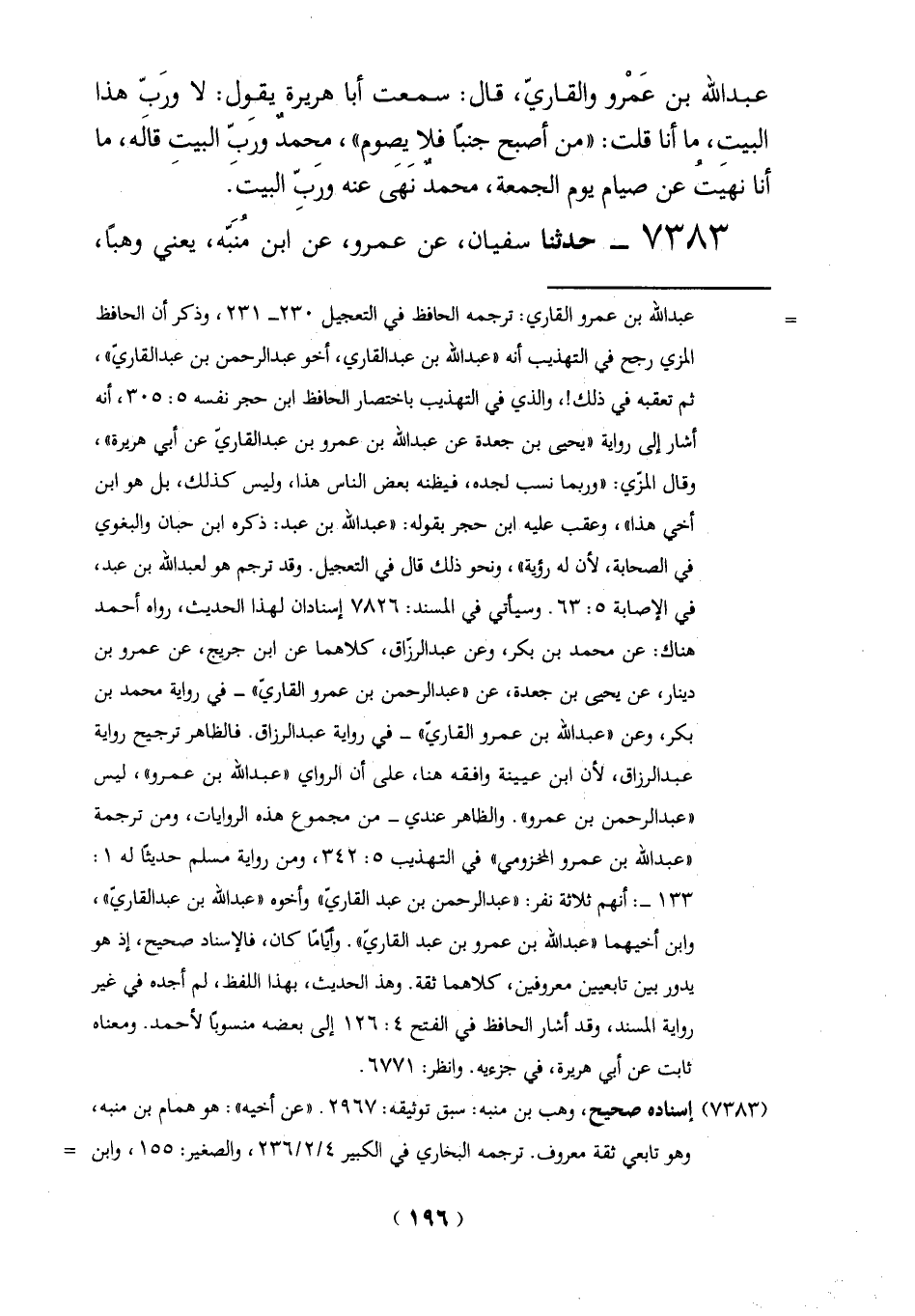 7383 - حدثنا سفيان، عن عمرو، عن ابن منَبّه، يعني وهبًا،