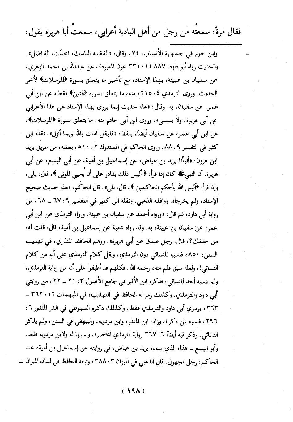 والحديث رواه أبو داود: 887 (1: 313 عون المعبود)، عن عبد الله بن محمَّد الزهري، عن سفيان بن عيينة، بهذا الإِسناد، مع تأخير ما يتعلق بسورة {الْمُرْسَلَاتِ} لأخر الحديث. وروى الترمذي 4: 215، منه، ما يتعلق بسورة {التِّينِ} فقط، عن ابن أبي عمر، عن سفيان، به. وقال: [هذا حديث إنما يروى بهذا الإِسناد عن هذا الأعرابي عن أبي هريرة، ولا يسمى". وروى ابن أبي حاتم منه، ما يتعلق بسورة {الْمُرْسَلَاتِ}، عن ابن أبي عمر، عن سفيان أيضاً، بلفظ: "فليقل آمنت بالله وبما أنزل". نقله ابنْ كثير في التفسير 9: 88. وروى الحاكم في المستدرك 2: 510، بعضه، من طريق يزيد ابن هرون: "أنبأنا يزيد بن عياض، عن إسماعيل بن أمية، عن أبي اليسع، عن أبي هريرة: أن النبي -صلي الله عليه وسلم -كان إذا قرأ: {أَلَيْسَ ذَلِكَ بِقَادِرٍ عَلَى أَنْ يُحْيِيَ الْمَوْتَى}، قال: بلى، وإذا قرأ: {أَلَيْسَ الله بِأَحْكَمِ الْحَاكِمِينَ}، قال: بلى". قال الحاكم: "هذا حديث صحيح الإِسناد، ولم يخرجاه. ووافقه الذهبي. ونقله ابن كثير في التفسير 9: 67 - 68، من رواية أبي داود، ثم قال: "ورواه أحمد عن سفيان بن عيينة. ورواه الترمذي عن ابن أبي عمر، عن سفيان بن عيينة، به. وقد رواه شُعبة عن إسماعيل بن أمية، قال: قلت له: من حدثك؟، قال: رجل صدف عن أبي هريرة". ووهم الحافظ المنذري، في تهذيب السنن: 850، فنسبه للنسائي دون الترمذي، ونقل كلام الترمذي على أنه من كلام النسائي!، ولعله سبق قلم منه، رحمه الله. فكلهم قد أطبقوا على أنه من رواية الترمذي، ولم ينسبه أحد للنسائي: فذكر ابن الأثير في جامع الأصول 3: 21 - 22، من روايتي أبي داود والترمذي. وكذلك رمز له الحافظ في التهذيب، في المبهمات 12: 362 - 363، برمزي أبي داود والترمذي فقط. وكذلك ذكره السيوطي في الدر المنثور 6: 62، فنسبه لمن ذكرنا، وزاد: ابن المنذر، وابن مردويه، والبيهقي في السنن، ولم يذكر النسائي. وذكر فيه أيضاً 6: 367 رواية الترمذي المختصرة، ونسبها له ولابن مردويه فقط.