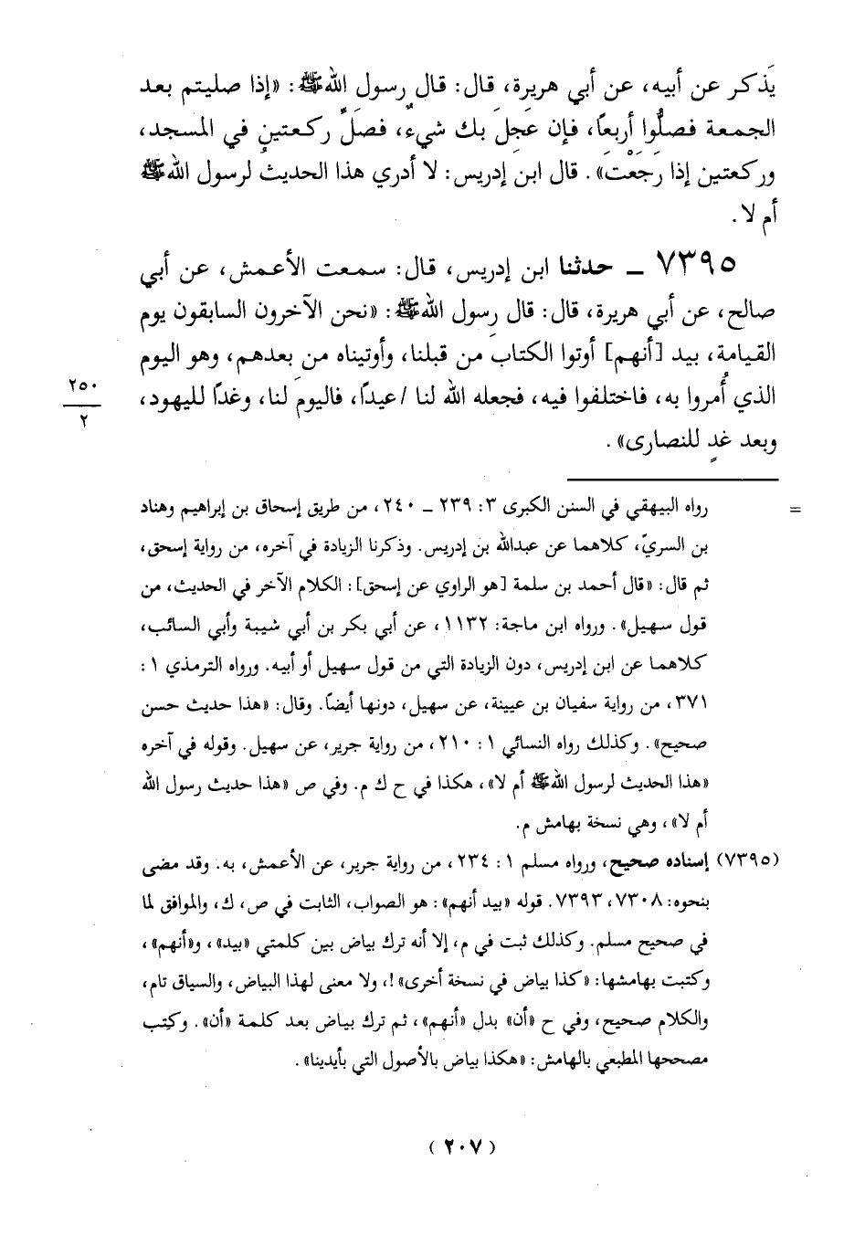 7395 - حدثنا ابن إدريس، قال: سمعت الأعمش، عن أبي صالح، عن أبي هريرة، قال: قال رِسول الله -صلي الله عليه وسلم-: "نحن الآخرون السابقون يوم القيامة، بيد [أنهم] أوتوا الكتاب من قبلنا، وأوتيناه من بعدهم، وهو اليوم الذي أُمروا به، فاختلفوا فيه، فجعله الله لنا عيدًا، فاليومَ لنا، وغدًا لليهود، وبعد غدٍ للنصارى".