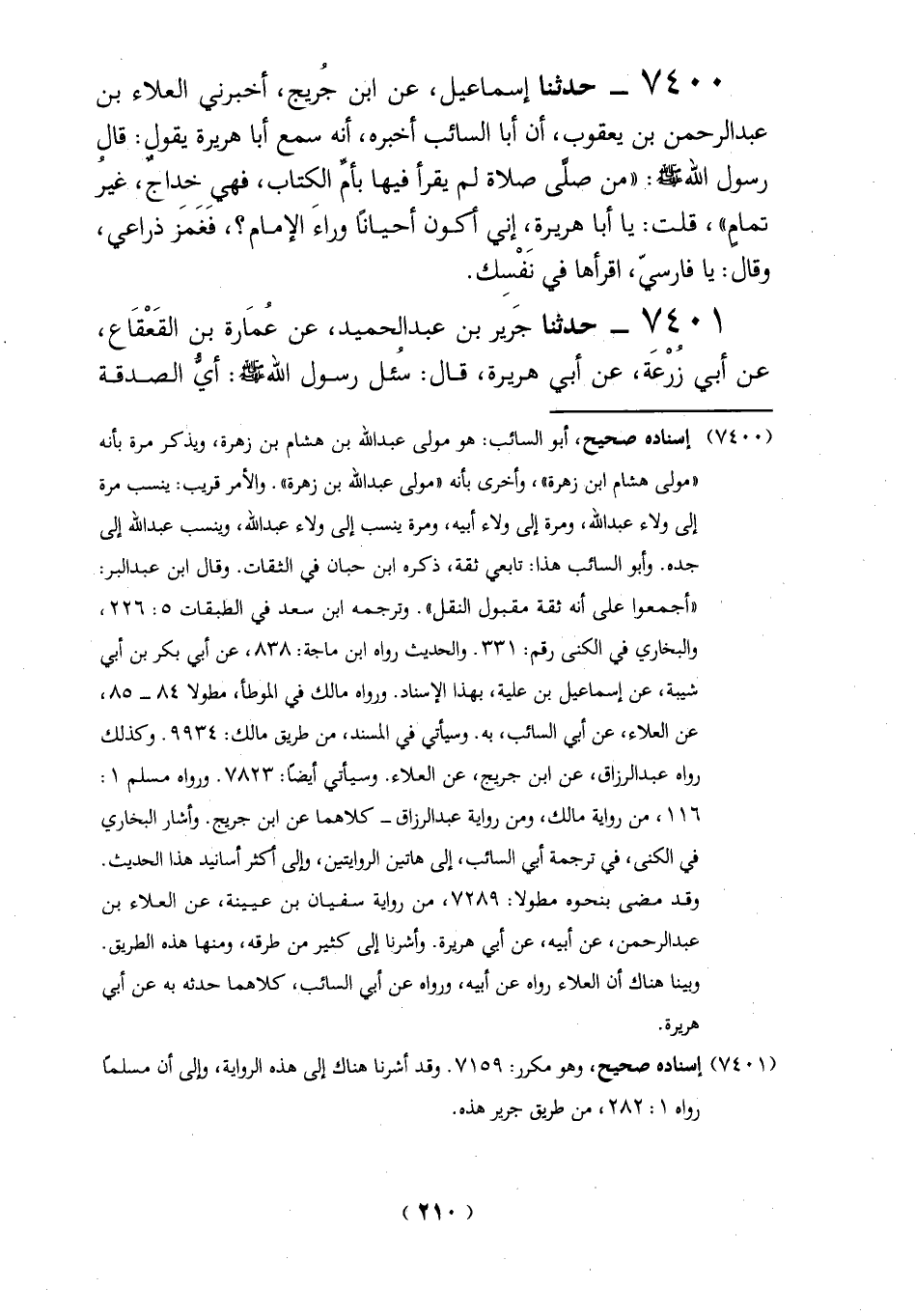 (7400) إسناده صحيح، أبو السائب: هو مولى عبد الله بن هشام بن زهرة، ويذكر مُرَّة بأنه "مولى هشام ابن زهرة"، وأخرى بأنه "مولى عبد الله بن زهرة". والأمر قريب: ينسب مرة إلى ولاء عبد الله، ومرة إلى ولاء أبيه، ومرة ينسب إلى ولاء عبد الله، وينسب عبد الله إلى جده. وأبو السائب هذا: تأبى ثقة، ذكره ابن حبان في الثقات. وقال ابن عبد البر: "أجمعوا على أنه ثقة مقبول النقل". وترجمه ابن سعد في الطبقات 5: 226، والبخاري في الكنى رقم: 313 - والحديث رواه ابن ماجة 838، عن أبي بكر بن أبي شيبة، عن إسماعيل بن علية، بهذا الإِسناد. ورواه مالك في الموطأ، مطولا 84 - 85،