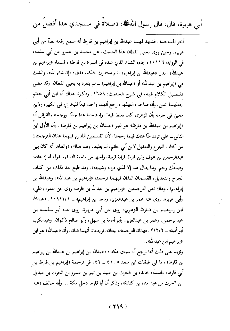 جعلهما اثنين، وأن صاحب التهذيب رجع أنهما واحد، تبعًا للبخاري في الكبير، ولابن معين في جزمه بأن الزهري كان يغلط فيه!، واستبعدنا هذا جداً، ورجحنا بالقرائن أن "إبراهيم بن عبد الله بن قارظ" هو غير "عبد الله بن إبراهيم بن قارظ". وأن الأول ابن الثاني - على تردد منّا هناك فيما رجحنا؛ لأن القسمين اللذين فيهما هاتان الترجمتان من كتاب الجرح والتعديل لابن أبي حاتم، لم يطبعا. وقلنا هناك: "والظاهر أنه كان بين عبد الرحمن بن عوف وابن قارظ قرابة قريبة، ولعلها من ناحية النساء، لقوله له إذ عاده: وصلتْك رحم. وما يقال هذا إلا لذي قرابة وشيجة". وقد طبع بعد ذلك، من كتاب الجرح والتعديل، القسمان اللذان فيهما ترجمتا "إبراهيم بن عبد الله"، وعبد الله بن إبراهيم"، وهاك نص الترجمتين: "إبراهيم بن عبد الله بن قارظ: روى عن عمر، وعلى، وأبي هريرة. روى عنه عمر بن عبد العزيز، وسعد بن إبراهيم"- 1/ 1/109. "عبد الله بن إبراهيم بن قارظ الزهري: روى عن أبي هريرة. روى عنه أبو سلمة بن عبد الرحمن، وعمر بن عبد العزيز، وأبو أمامة بن سهل، وأبو صالح ذكوان، وعبد الكريم أبو أمية" - 2/ 2/ 2. فهاتان الترجمتان بينتان، ترجحان أنهما اثنان، وأن "عبد الله" هو ابن "إبراهيم بن عبد الله" ..
