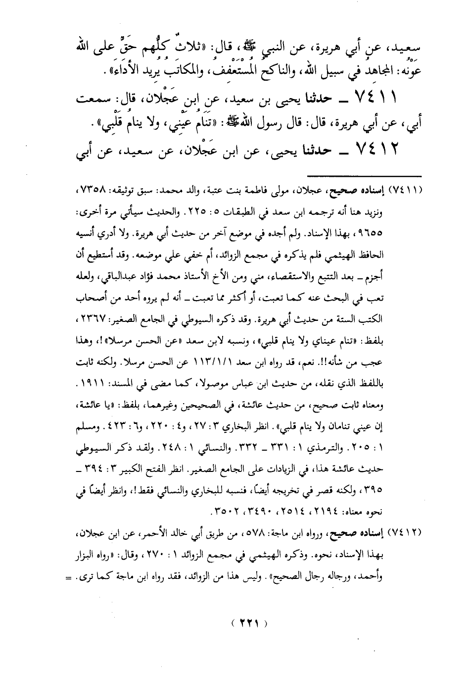 7411 - حدثنا يحيى بن سعيد، عنِ ابن عَجْلان، قال: سمعت أبي، عن أبي هريرة، قال: قال رسول الله -صلي الله عليه وسلم -: "تنَامُ عينِي، ولا ينام قَلْبِي".