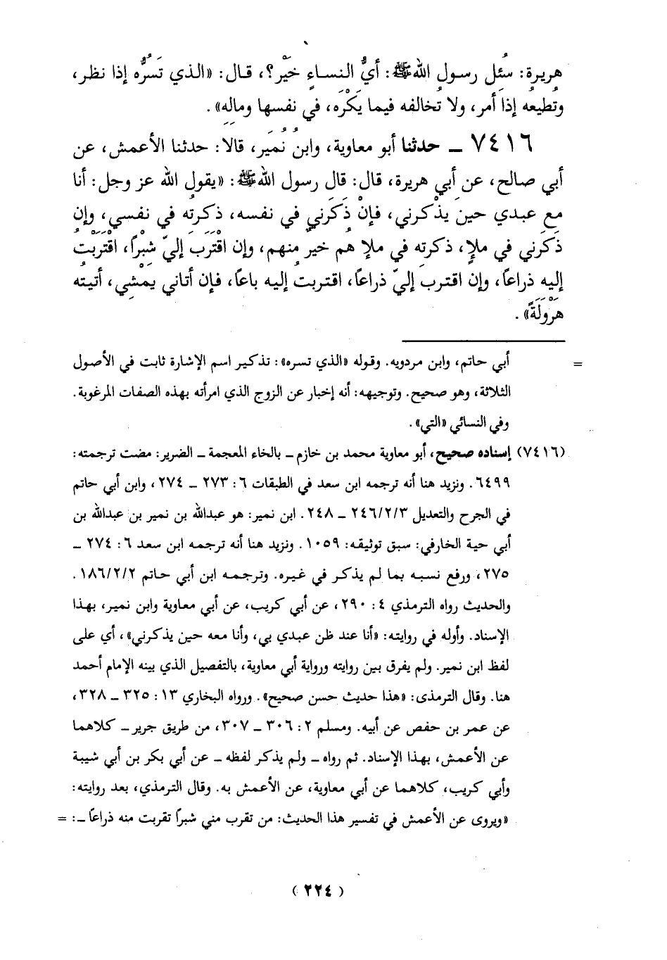 7416 - حدثنا أبو معاوية، وابنُ نُمَير، قالا: حدثنا الأعمش، عن أبي صالح، عن أبي هريرة، قال: قال رسول الله-صلي الله عليه وسلم-: "يقول الله عز وجل: أنا مِعِ عبدي حينَ يذْكرني، فإنْ ذَكَرني في نفسه، ذكرته في نفسي، وإن ذكرني في ملإٍ، ذكرته في ملإ هُم خيرٌ منهم، وإن اقْتَرَبَ إليّ شبْرًا، اقْتَرَبْت إليه ذراعًا، وإن اقتربَ إليّ ذراعًا، اقتربتُ إليه باعًا، فإن أتانى يَمْشِي، أتيته هَرْوَلَةً".