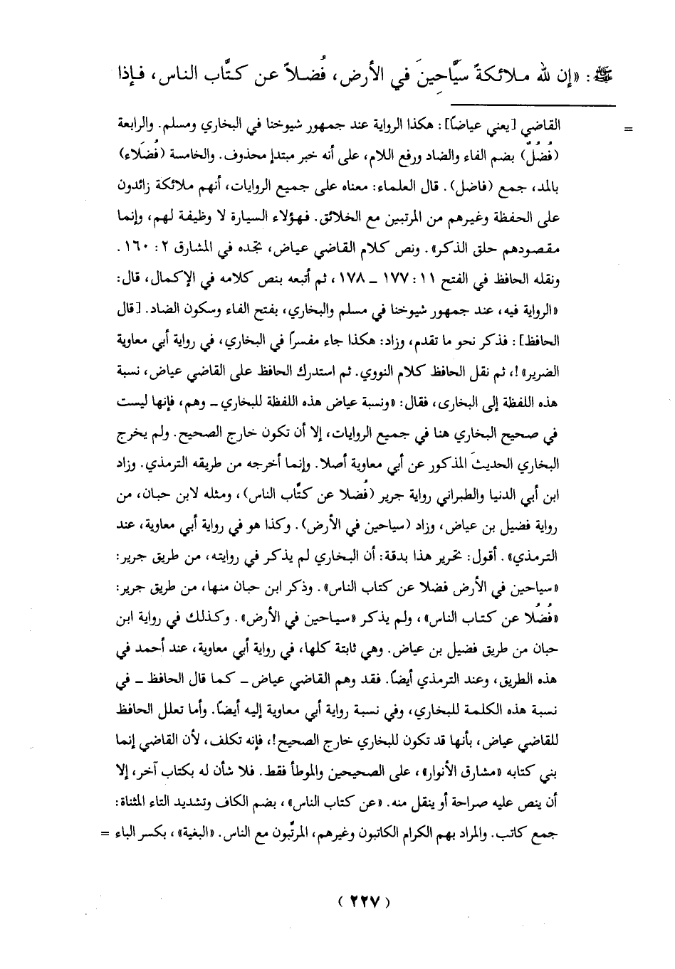 ونقله الحافظ في الفتح 11: 177 - 178، ثم أتبعه بنص كلامه في الإكمال، قال: "الرواية فيه، عند جمهور شيوخنا في مسلم والبخاري، بفتح الفاء وسكون الضاد. [قال الحافظ]: فذكر نحو ما تقدم، وزاد: هكذا جاء مفسرًا في البخاري، في رواية أبي محاولة الضرير"!، ثم نقل الحافظ كلام النووي. ثم استدرك الحافظ على القاضي عياض، نسبة هذه اللفظة إلى البخاري، فقال: "ونسبة عياض هذه اللفظة للبخاري - وهم، فإنها ليست في صحيح البخاري هنا في جميع الروايات، إلا أن تكون خارج الصحيح. ولم يخرج البخاري الحديثَ المذكور عن أبي معاوية أصلاً. وإنما أخرجه من طريقه الترمذي. وزاد ابن أبي الدنيا والطبراني رواية جرير (فُضلا عن كتَّاب الناس)، ومثله لابن حبان، من رواية فضيل بن عياض، وزاد (سياحين في الأرض). وكذا هو في رواية أبي معاوية، عند